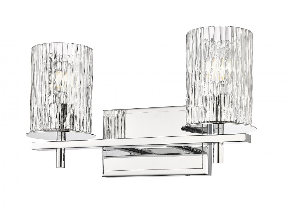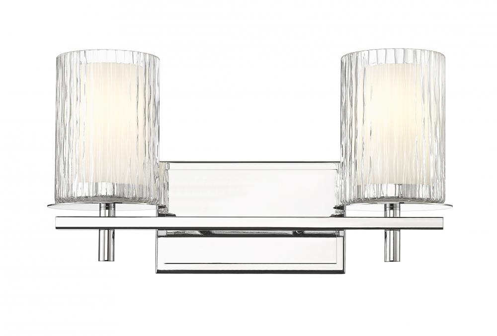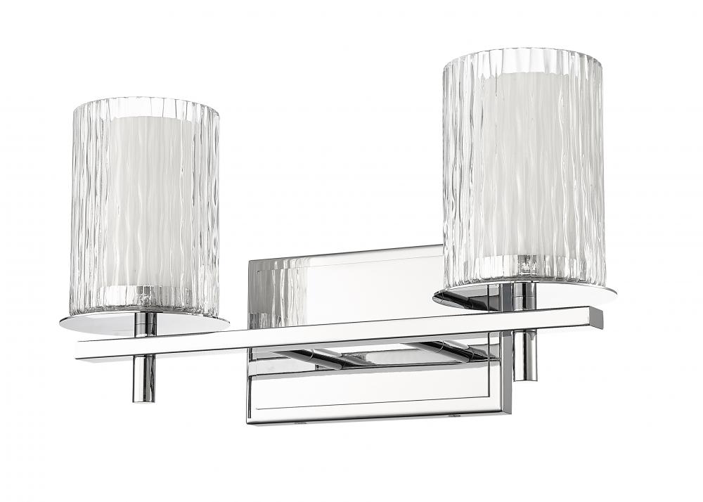 Timeless beauty follows the layered multi-part design of a glass and steel two-light vanity light, a perfect solution for conquering lighting challenges in a contemporary space. Intricate detail is textural and artisan with clear glasswork in a cylinder shape, with an inner white diffuser. Etched opal and clear glass blend as they enhance radiant chrome finish framing and show off a crisp mix of circles and lines.