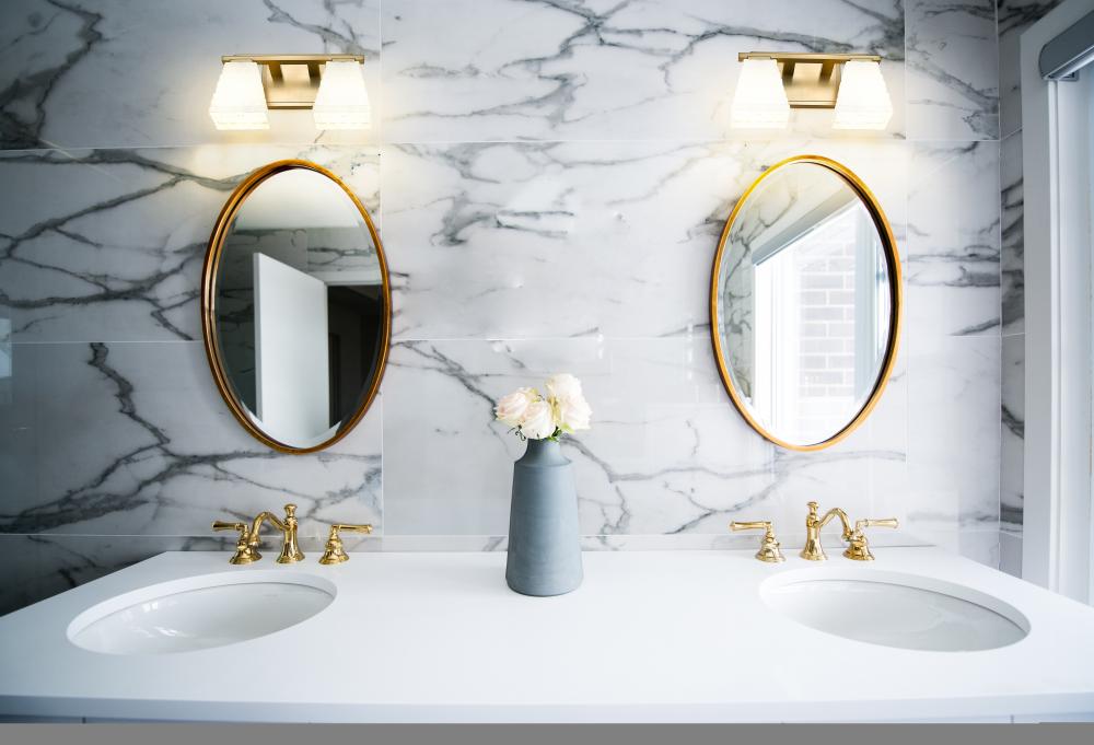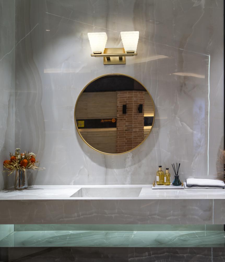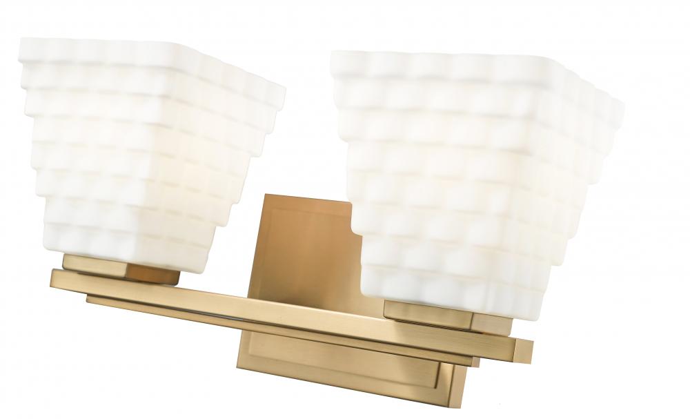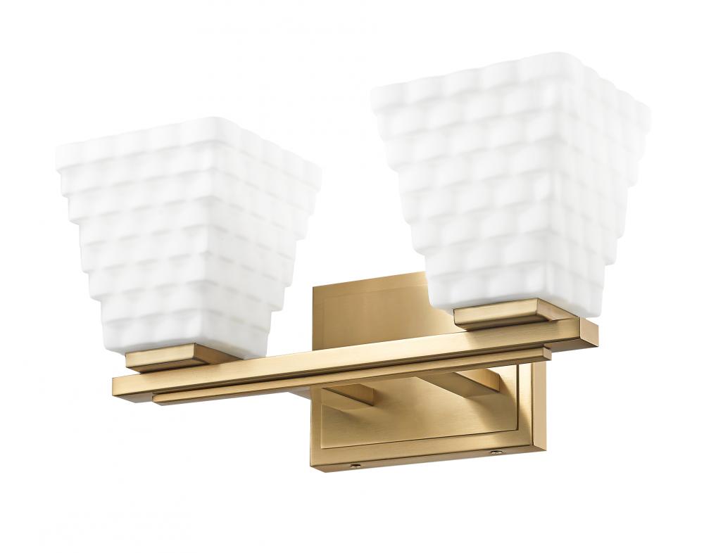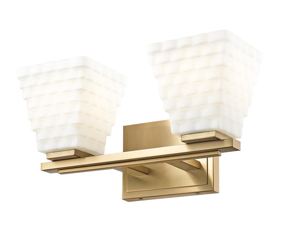 Upgrade a bathroom or dressing area with this modern two-light vanity bath light. In modern gold with opal glass shades, the fixture showcases myriad layered details, creating impressive texture and dimensionality in your bath. Shades are a tapering square silhouette, each casting bright uplighting perfect for ambiance and daily grooming and beauty rituals.