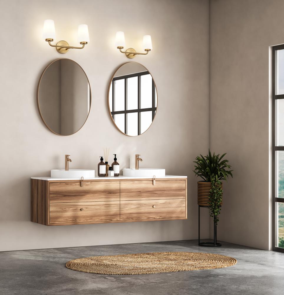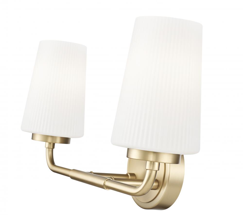 Tapering, ribbed shades are crafted in opal glass, creating soft, inviting ambiance for this modern two-light vanity sconce. A round wall plate and gently curved arm complete its refined silhouette, and it can be installed with lights up or down to suit your space. A modern gold finish is clean and classic, lending richness and warmth in a primary or guest suite.