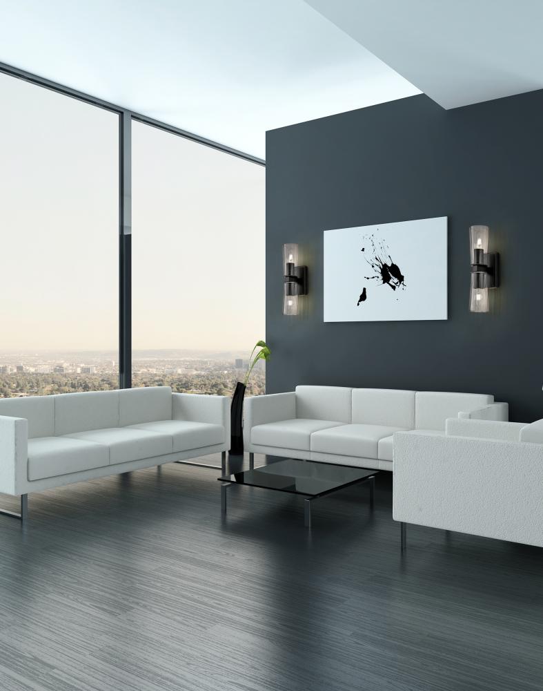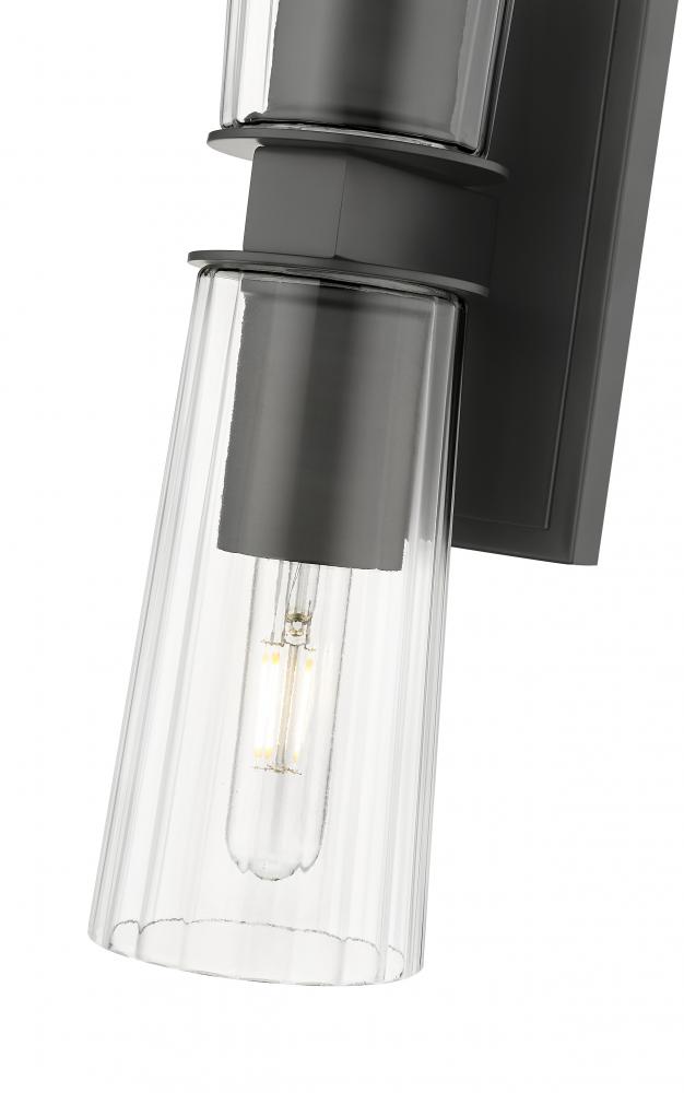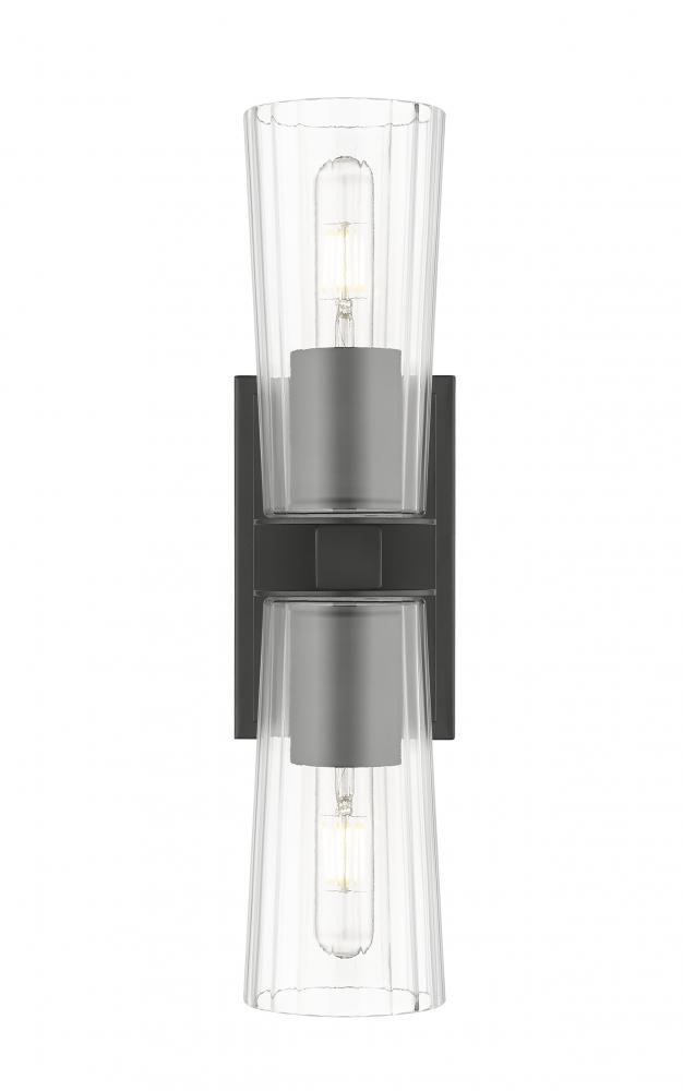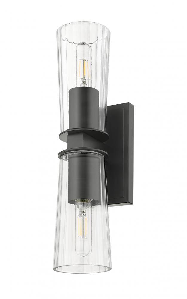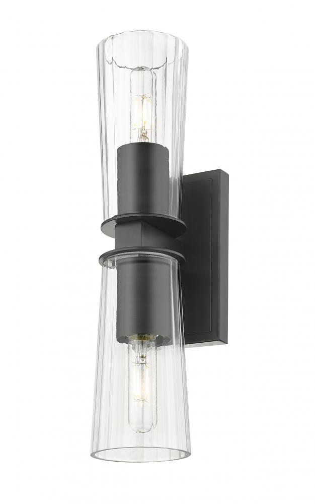 Tapering clear glass shades create a fresh, refined silhouette for a modern two-light wall sconce. A matte black finish adds contrast and distinction to an understated wall plate, while the lights add character with tubular bulbs that offer a touch of vintage charm to your contemporary or industrial decor.