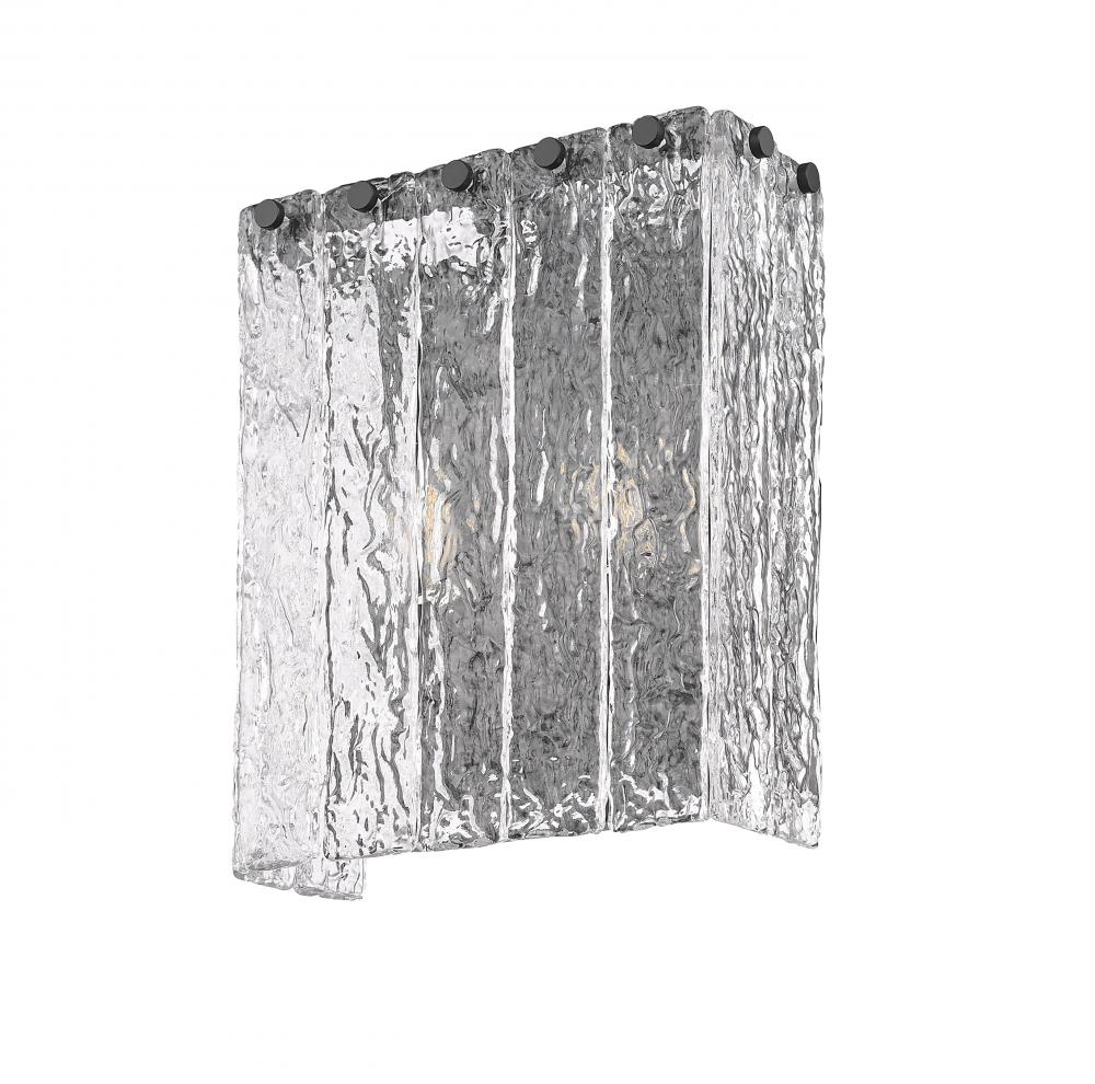Upgrade your vanity or foyer with the eye-catching texture and dimensionality of this modern two-light wall sconce. It features a pair of lights tucked behind vertical panels of icy clear glass, creating its cool sophistication. A matte black finish graces its steel frame and flat bolt head details, creating fresh contrast and depth.