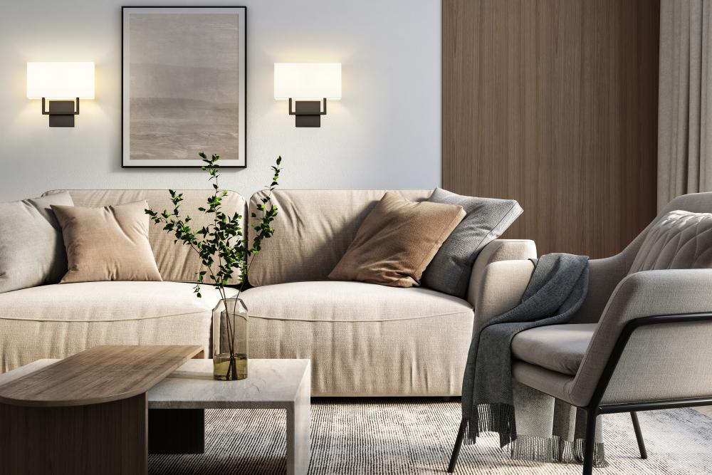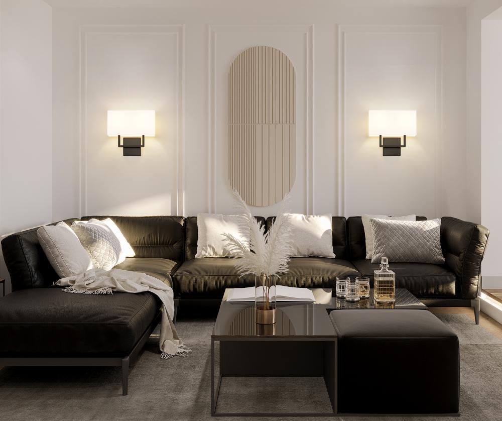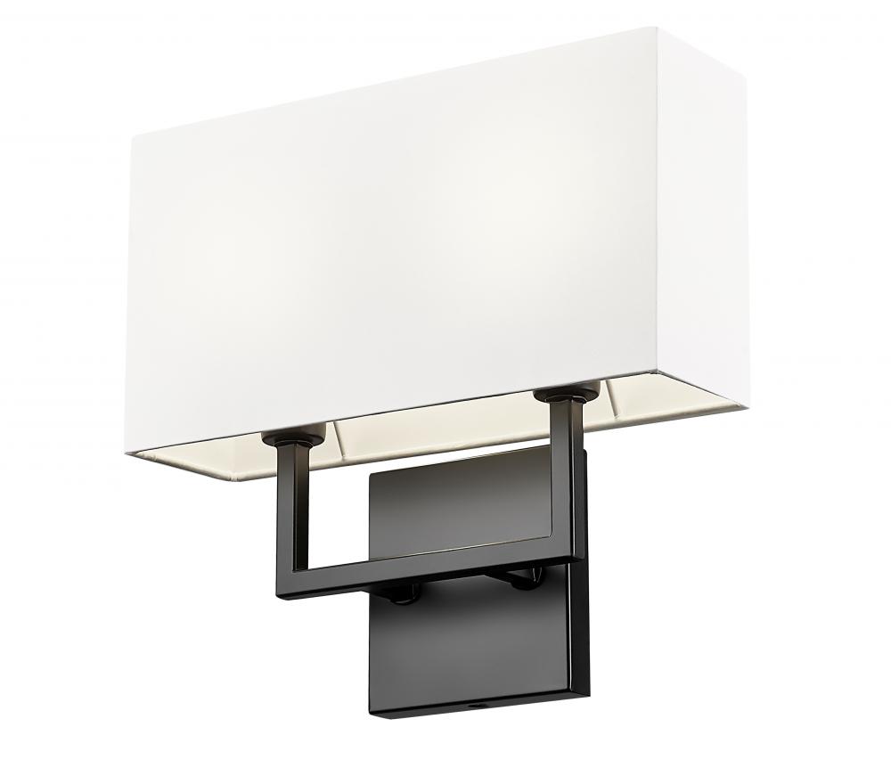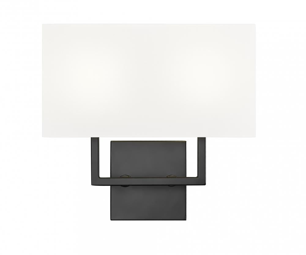 Clean-lined design highlights this modern two-light wall sconce. Perfect for an entry or living room, its a low profile design with a half-shade in white fabric, casting inviting, true illumination. An angular arm design is augmented with a matte black finish, delivering crisp contrast against your walls.