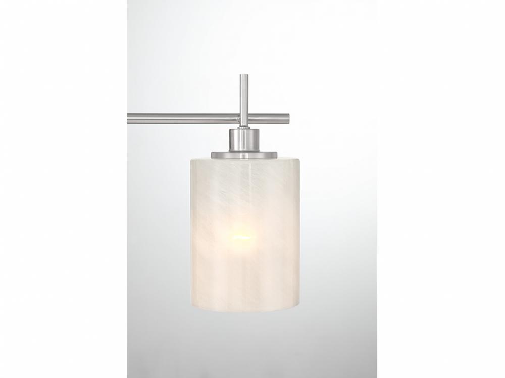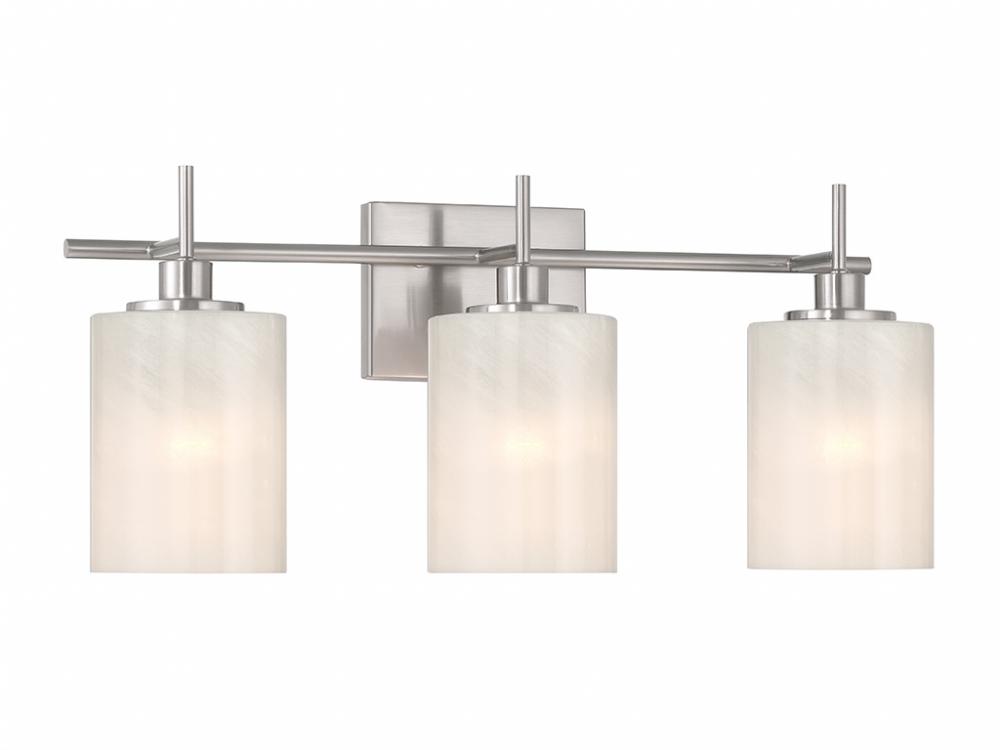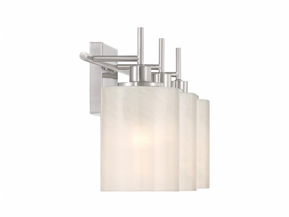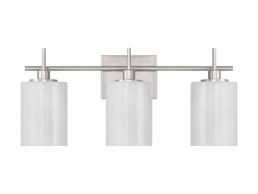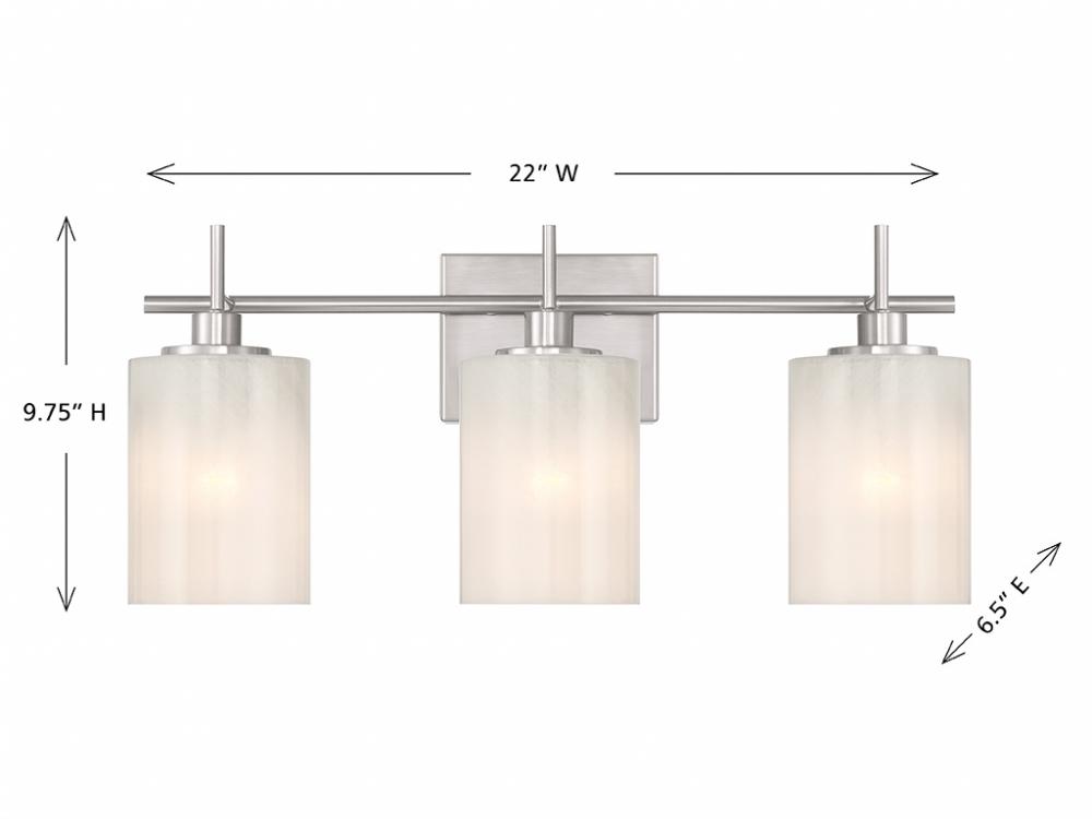 Brighten up your bath easily and beautifully with this 3-light bath bar, which showcases shades of strie glass featuring dazzling swirls that draw the eye, soften the glow and work beautifully with the Brushed Nickel finish. It is 9.75" in height, 22" in width and extends 6.5" from the wall. Uses three standard size bulbs of up to 60 watts per bulb. Bulbs not included.