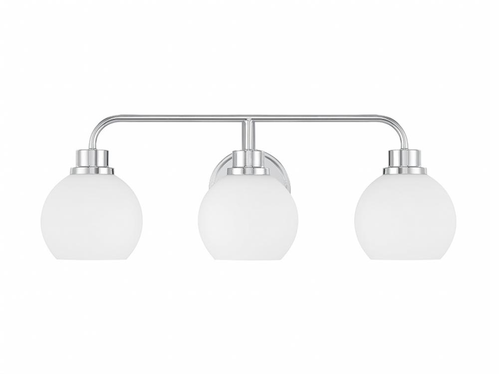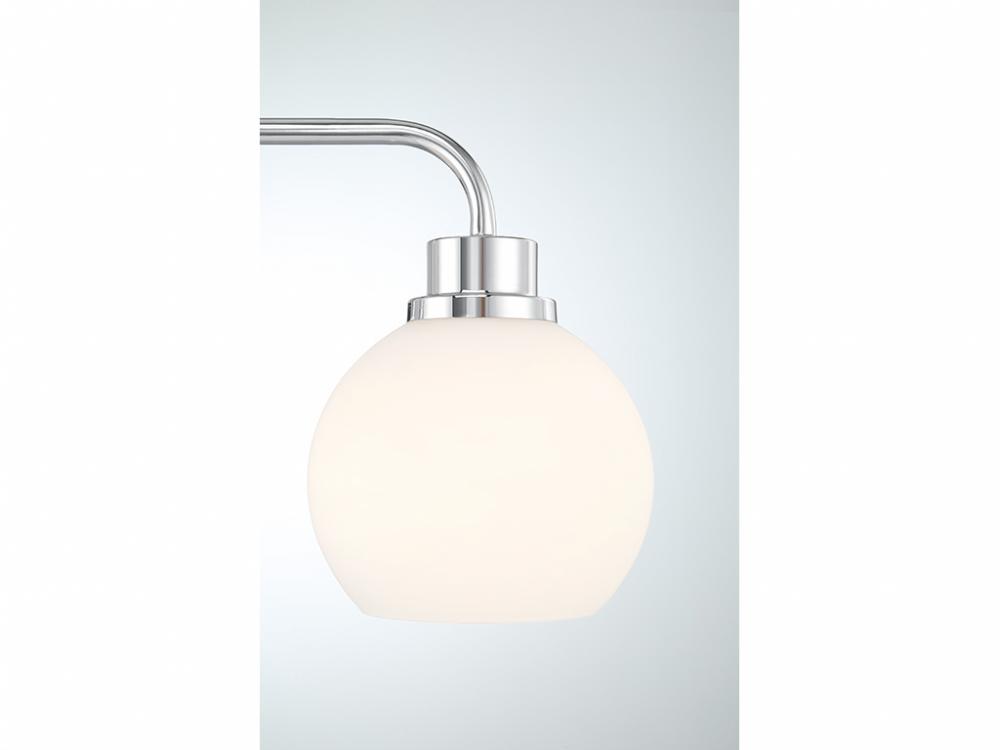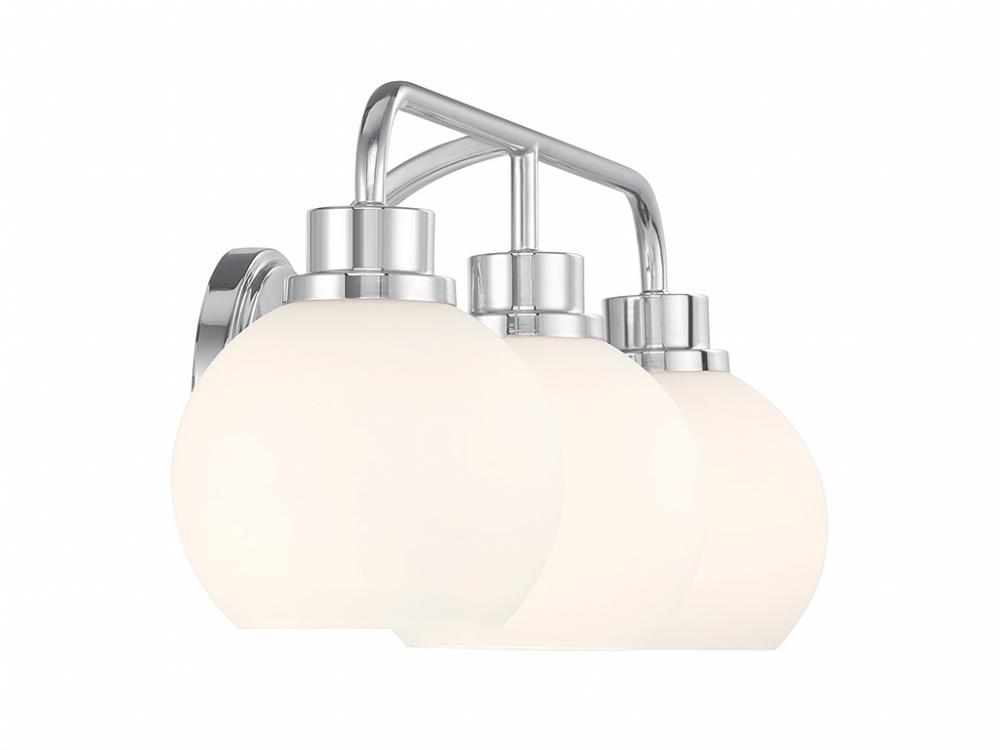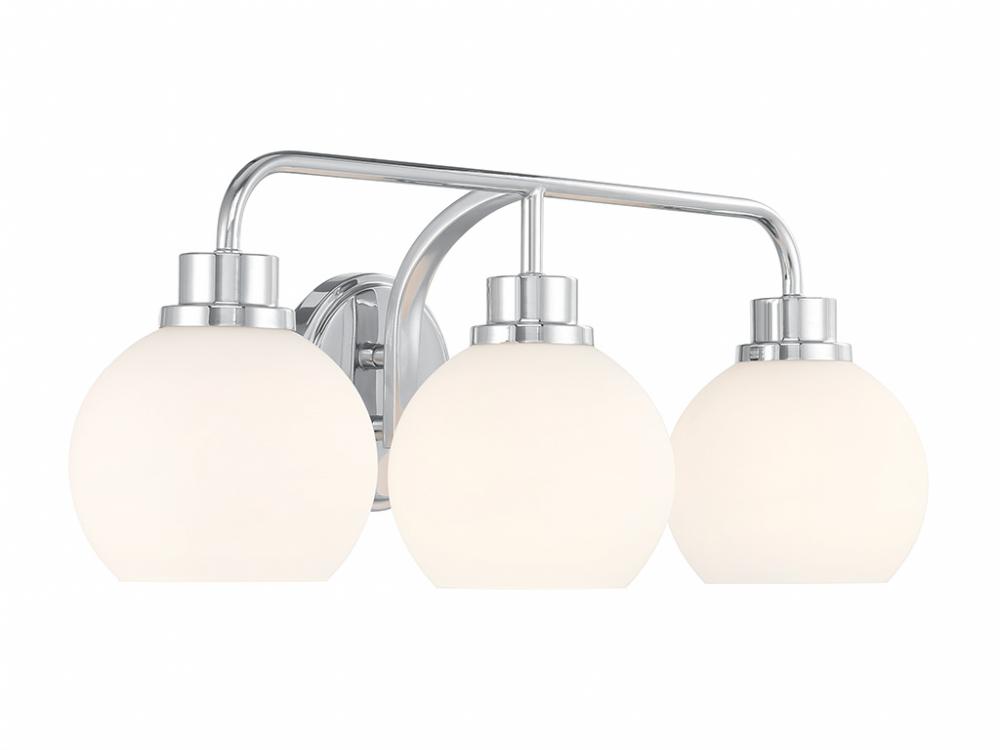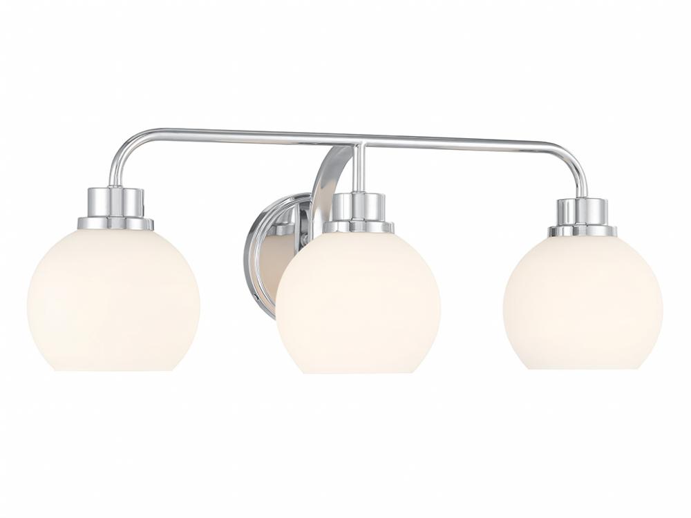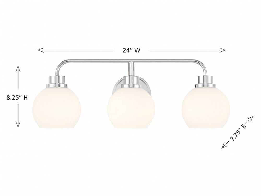 Freshen up your bathroom with the sleekly timeless style of this 3-light bath bar, which features orb-shaped shades of white opal glass that are open at the bottom and a versatile Chrome finish. It is 8.25" in height, 24" in width and extends 7.75" from the wall. It uses 3 standard size bulbs of up to 60 watts per bulb. Bulbs not included.