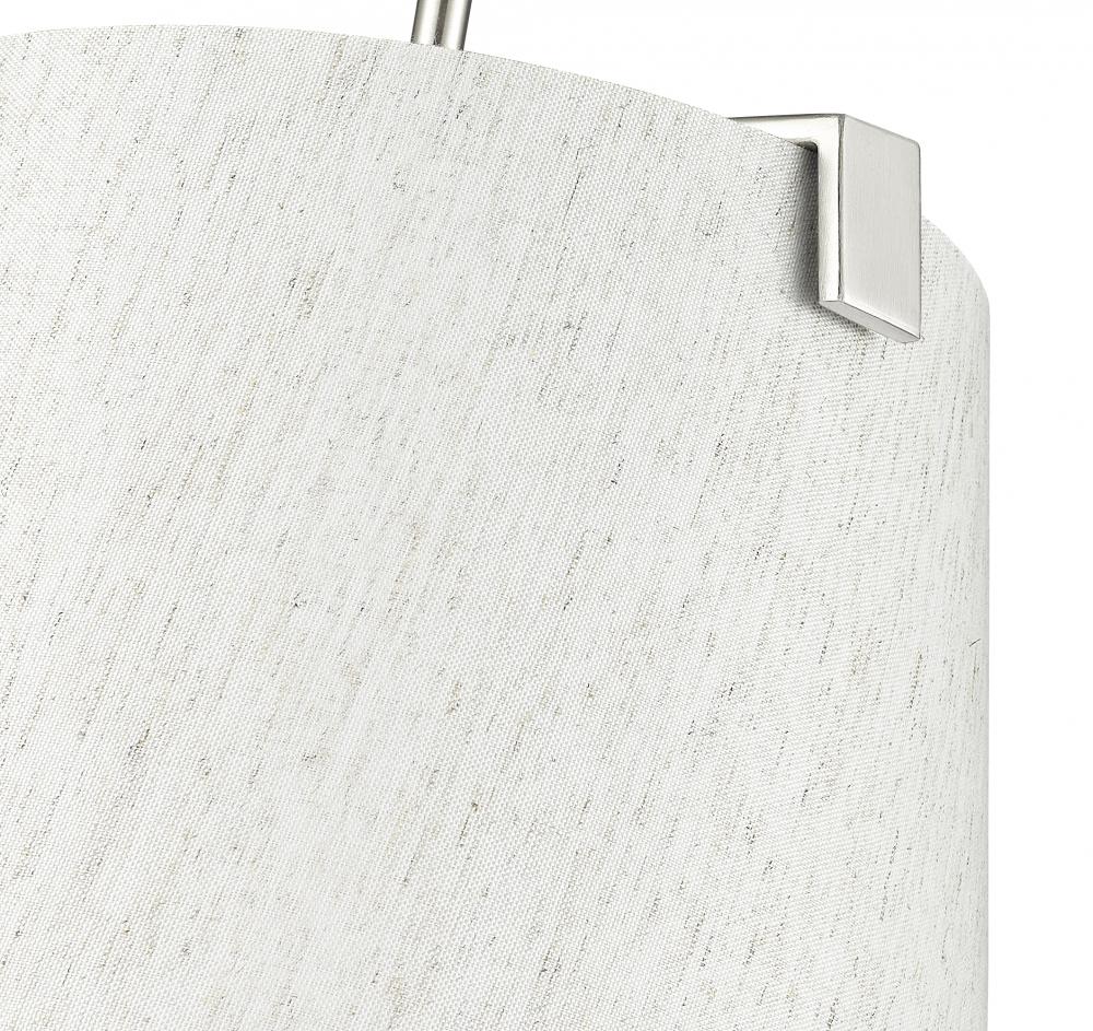 Make a statement in a modern or transitional space with a classic design in fixtures. This three-light pendant highlights islands or living spaces with a sophisticated look, blending brushed nickel finish steel framing and accent clips to a cream fabric shade, as candelabra lights filter through the diffused shade. This dimmable fixture offers variable lighting levels to suit different spaces.