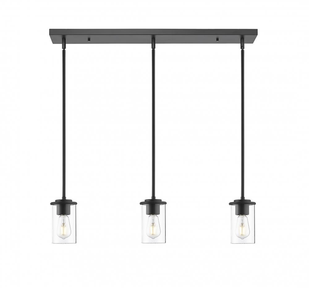 Set the tone in a warm, welcoming kitchen or dining room with the sleek, modern style of a three-light linear pendant. Ideal over an island or breakfast nook, it boasts a classic silhouette with a rectangular canopy and straight suspension, all in a bold matte black finish. Each of three lights is surrounded with a cylinder of clear glass, allowing for bright, true illumination.