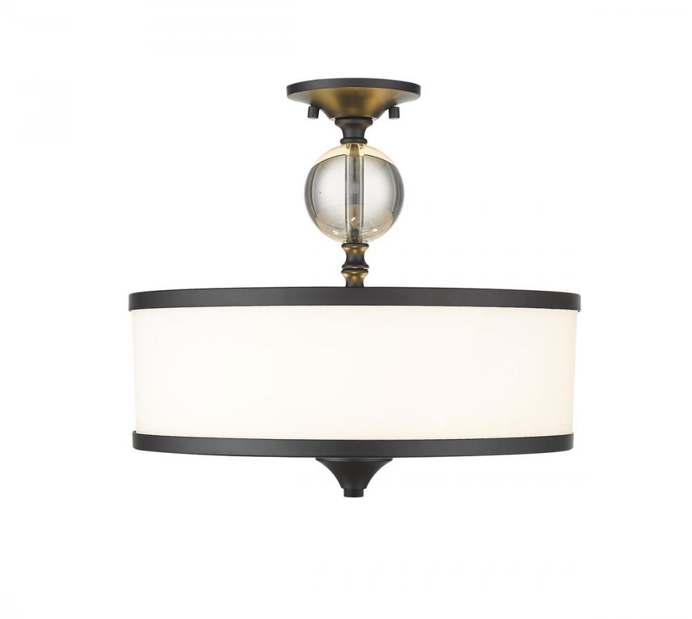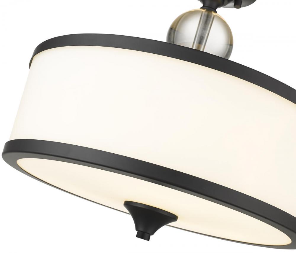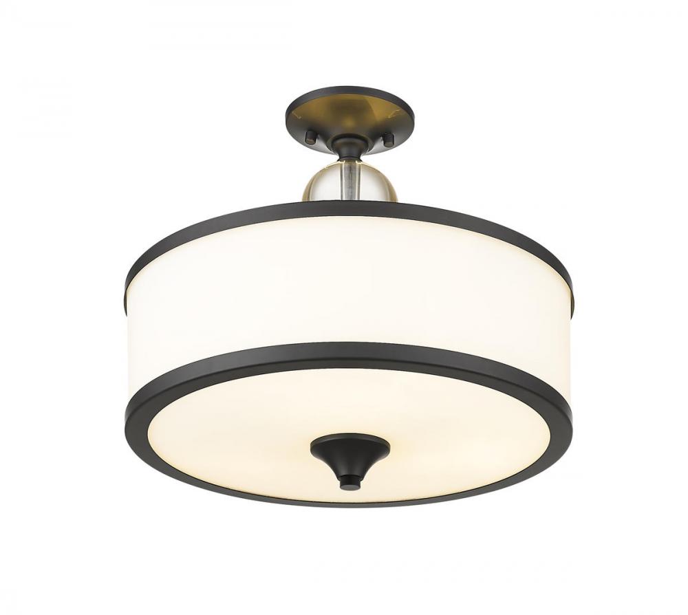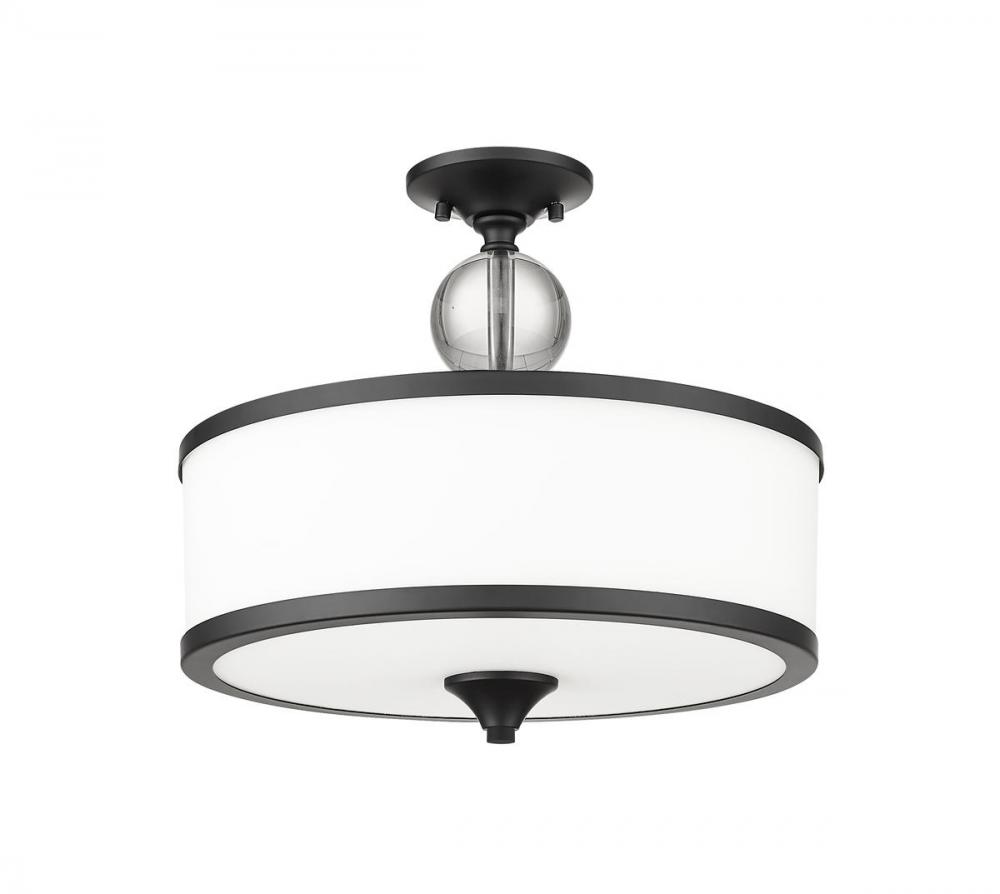 Introduce artisanal effects that stylize this three-light semi flushmount ceiling light, a modern fixture with soft, romantic flavor. This light from the Cosmopolitan collection delivers a deep etched milk white shade dressed up with matte black finish bands and a matching contemporary finial. Choose this light to illuminate a custom dining space, hallway, or main living area.