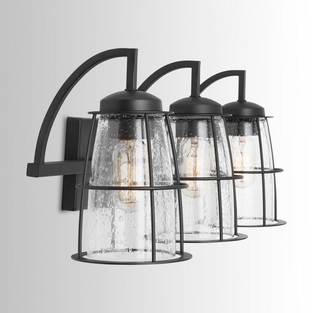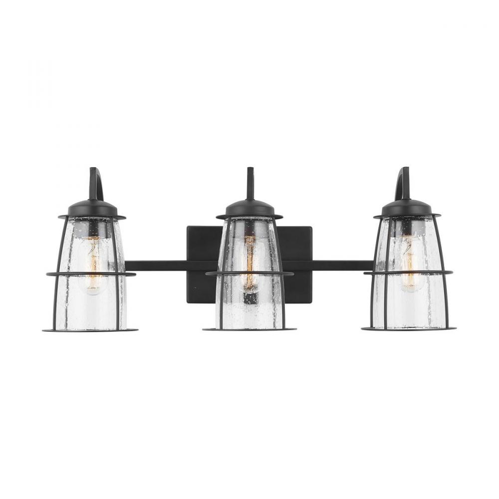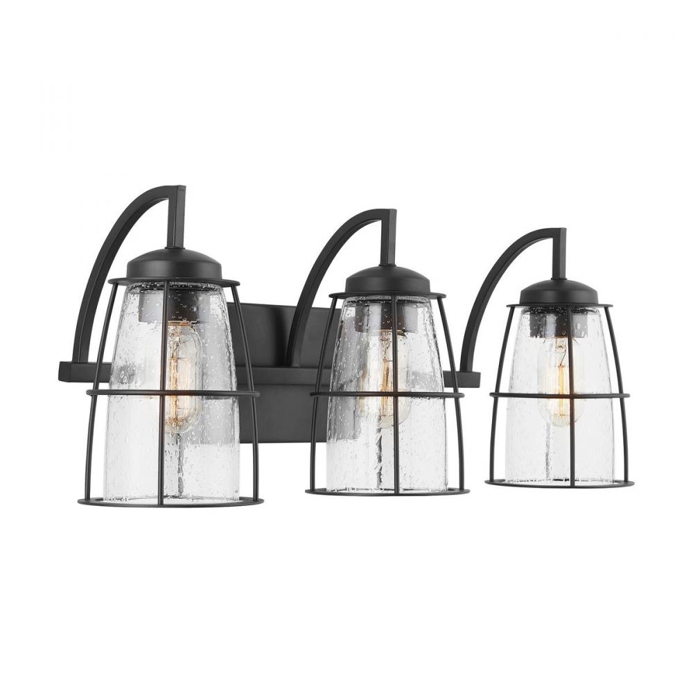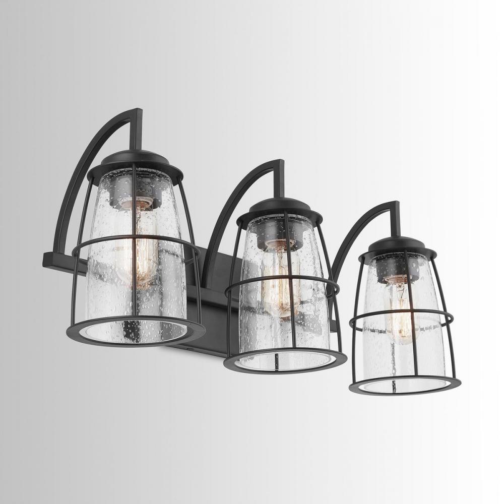 3-Light Vanity with Clear Seeded Glass with Metal Cage Shades