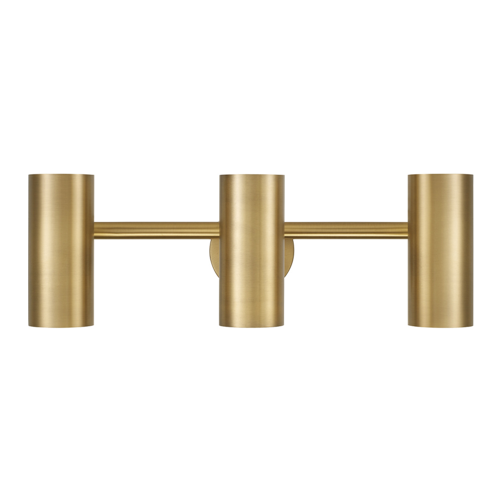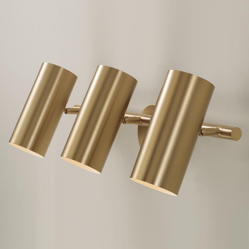 Smooth, cylindrical forms create the Robbie Vanity. Finished in Aged Brass, this contemporary luminaire showcases a touch of contrast with an interior White finish. Each metal cylinder pivots to direct the illumination, bringing modern versatility to beautiful task lighting.
