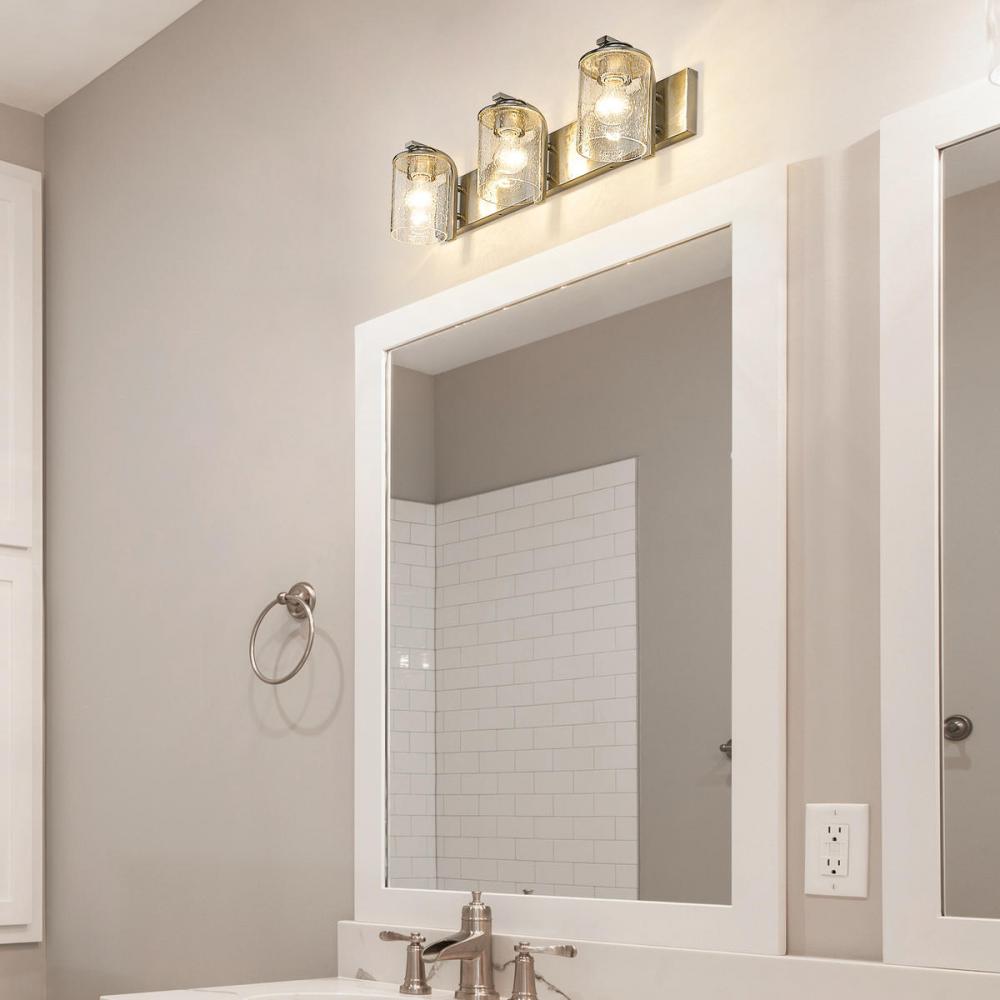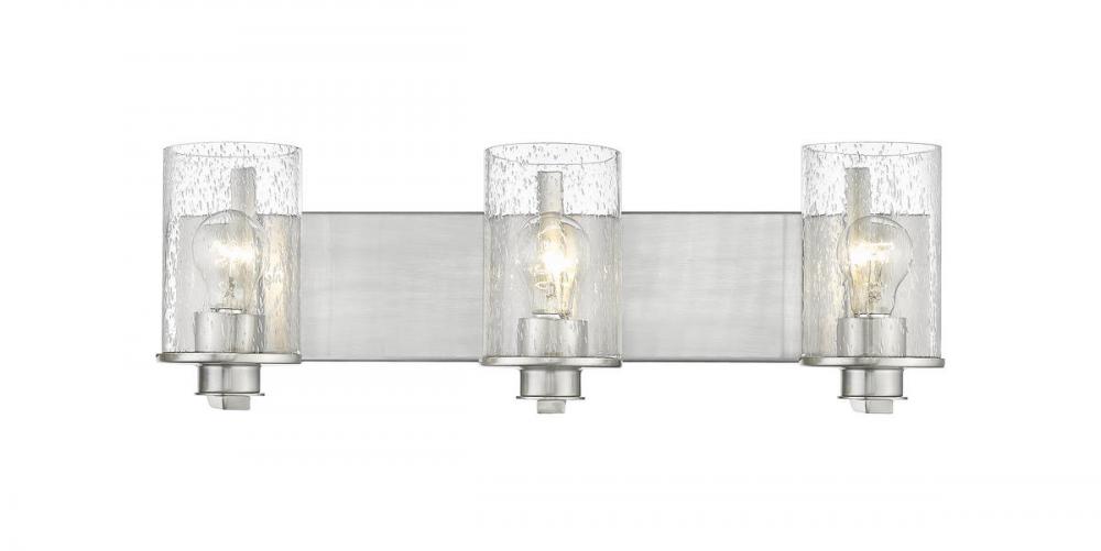 Light up a modern or transitional bath space with this elegant three-light vanity light from the Beckett collection. Showcasing a hint of village nautical fare, its romantic clear seedy glass cylinder shades offer a heady effect. A rectangular steel mount and accents fashioned of classic brushed nickel finish steel deliver a tasteful aesthetic.