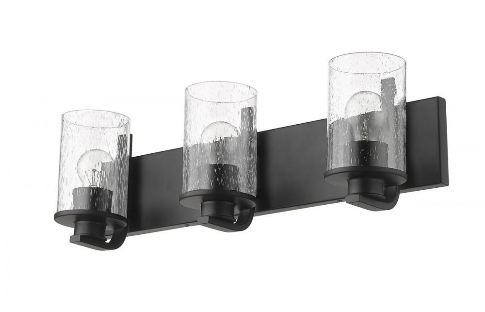 Light up a modern or transitional bath space with this elegant three-light vanity light from the Beckett collection. Showcasing a hint of village nautical fare, its romantic clear seedy glass cylinder shades offer a heady effect. A rectangular steel mount and accents fashioned of bold matte black finish steel deliver a tasteful aesthetic.