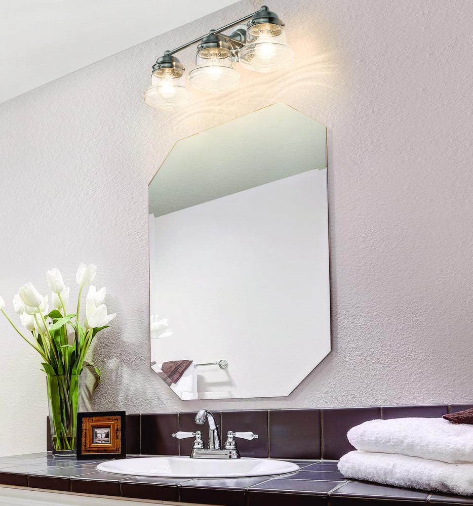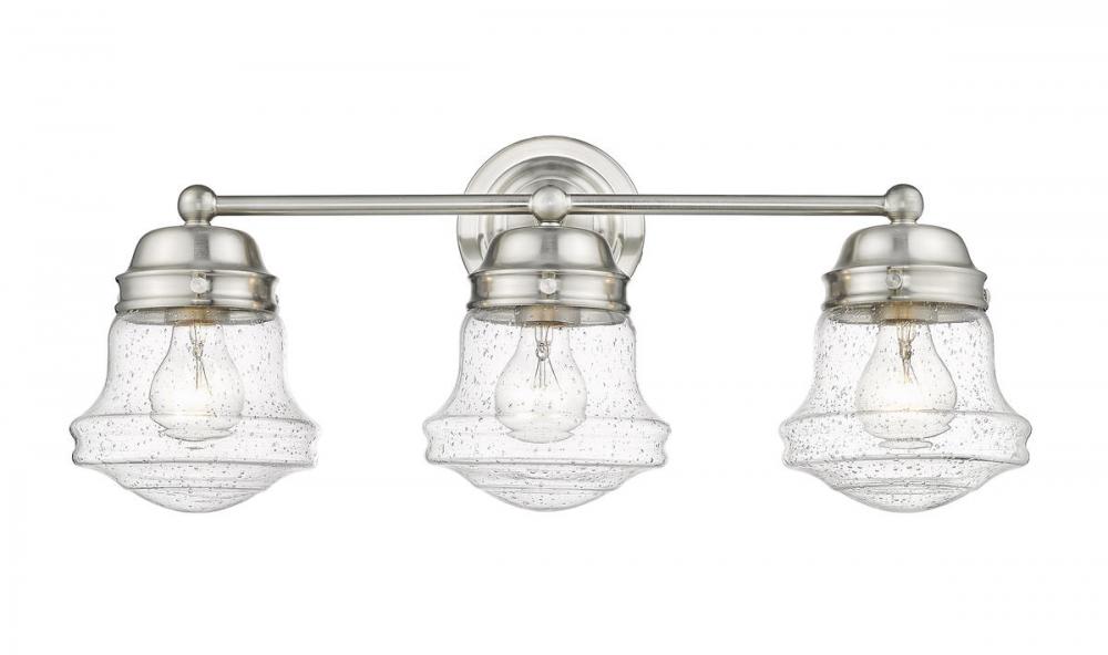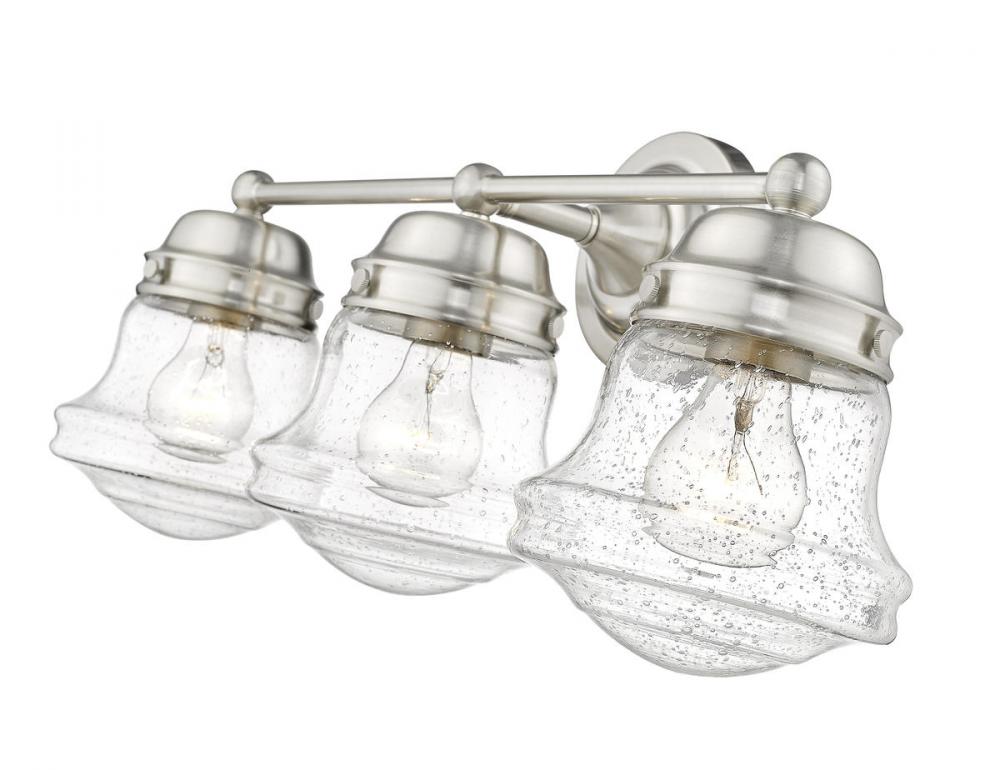 Charming schoolhouse style shades crafted of romantic clear seedy glass tell the story of a nautical industrial theme that lends a ton of style to this three-light vanity light. Perfectly suited for a traditional or transitional bath space, this light from the Vaughn collection contrasts cool brushed nickel finish steel with clear seedy glass, delivering a striking look that is timeless and elegant. This light fixture stands out as a central focus.