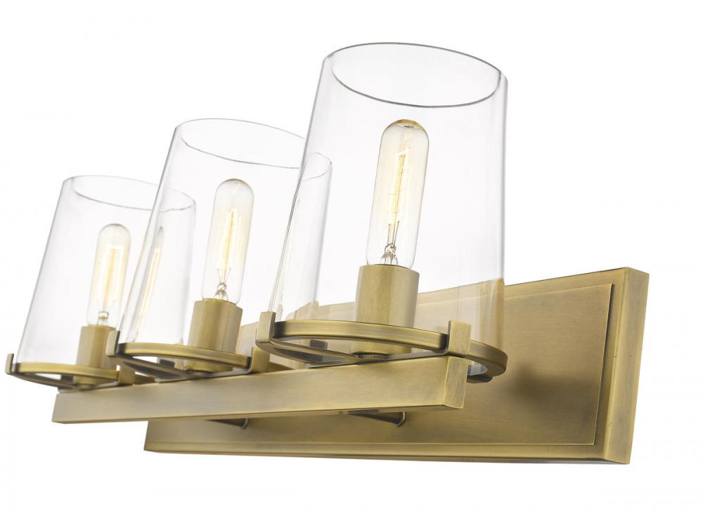 Showcasing a rich, rubbed brass finish, this metal vanity light makes a stylish impression in a modern powder room. Three tapered, clear glass shades complete the design in effortlessly elegant style.