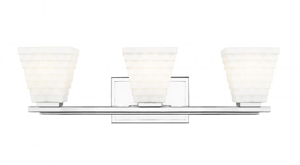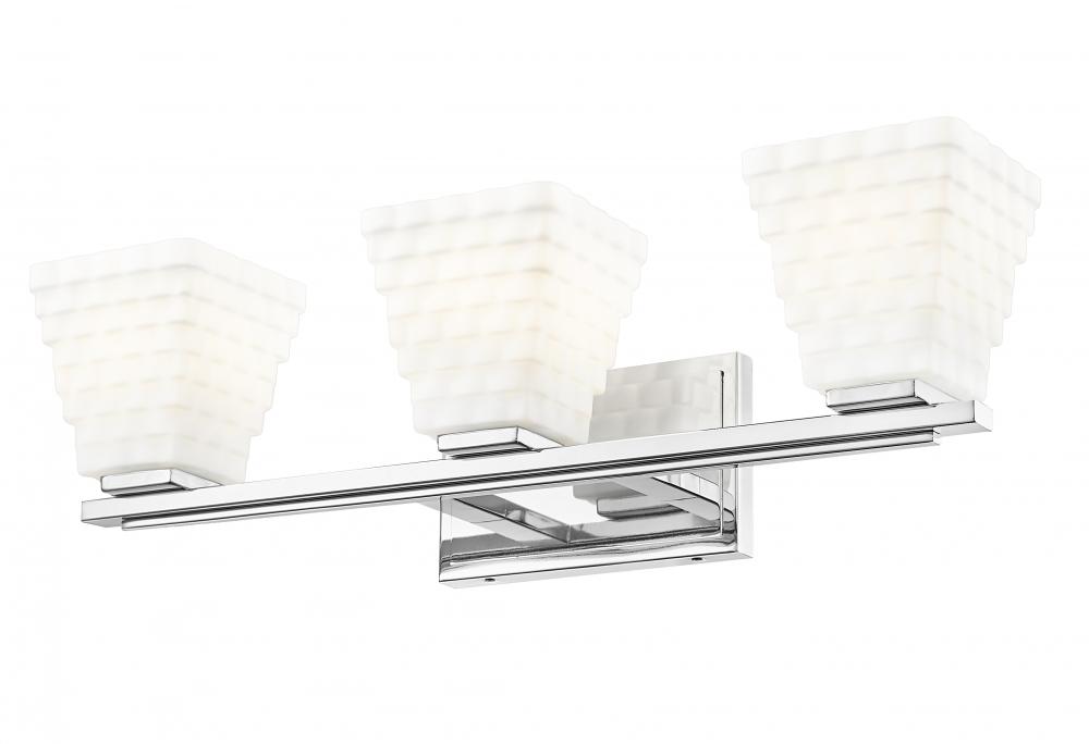 Cast bright ambient illumination through your space with this modern three-light vanity bath light. Matte opal glass is delicately layered to create a tapering square silhouette for each of three shades as they diffuse illumination. A layered arm and backplate receive a gleaming chrome finish, offering a fresh look and feel in your en suite or guest bathroom.