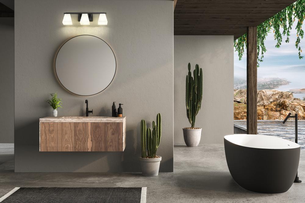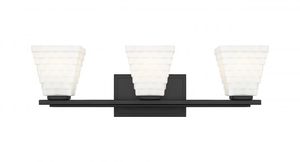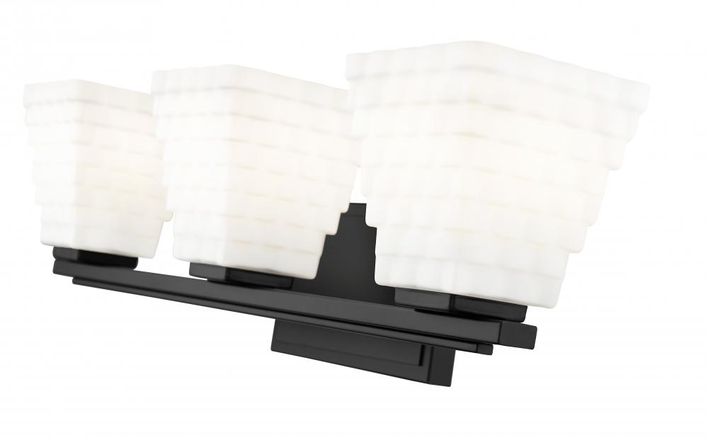 Introduce rich contrast and dimension with the compelling matte black and white color palette of this modern three-light vanity bath light. It shows off a metal frame with subtle layered details, creating character and depth. A trio of shades are tapering square silhouettes with layered matte opal glass, creating inviting, diffused illumination perfect for all your morning and evening rituals.
