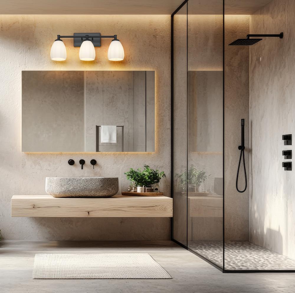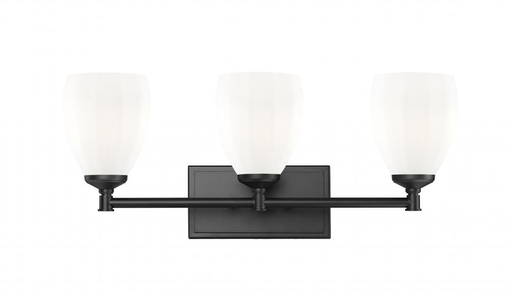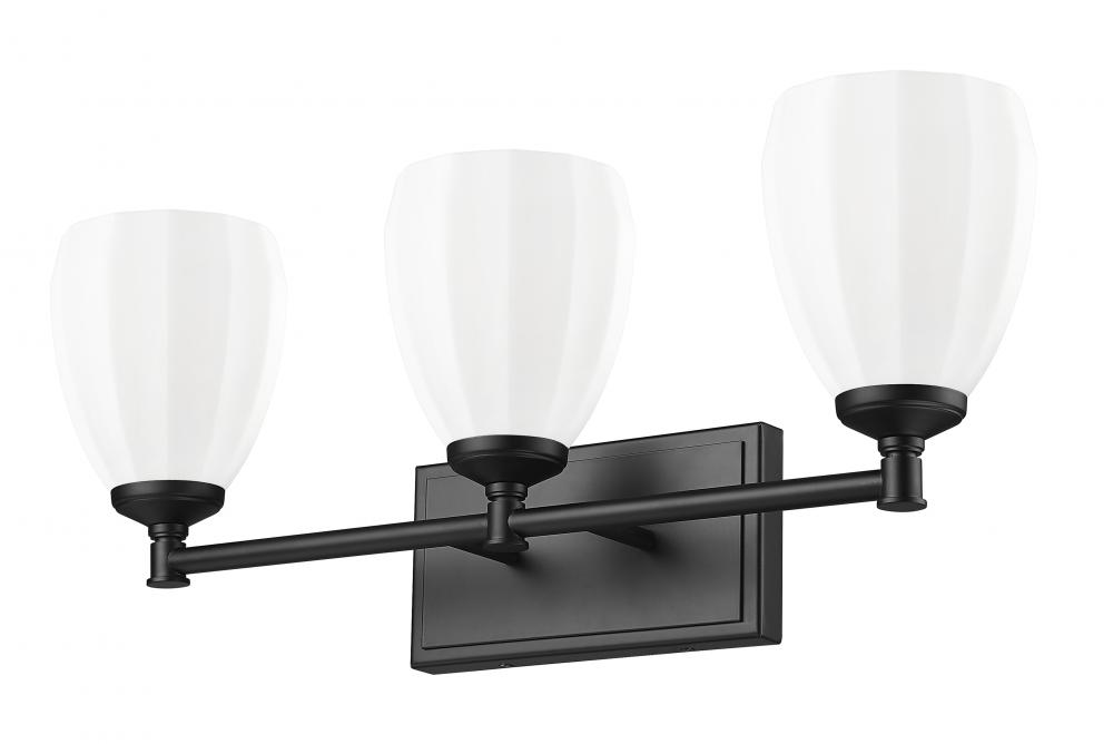 Capture the richness of clean, simple lines paired with elegant finishes on this modern three-light vanity wall light. In matte black, it adds bold contrast against most walls, ensuring eye-catching character. Three lights are surrounded with matte opal glass, casting bright, diffused illumination perfect for grooming and beauty tasks or ambiance.