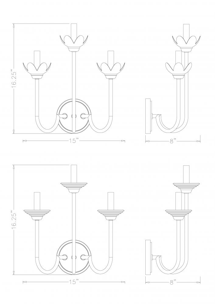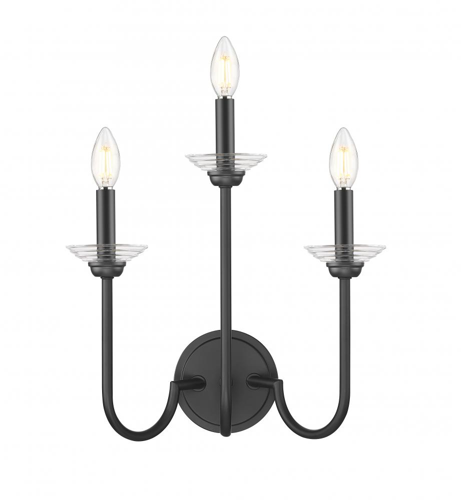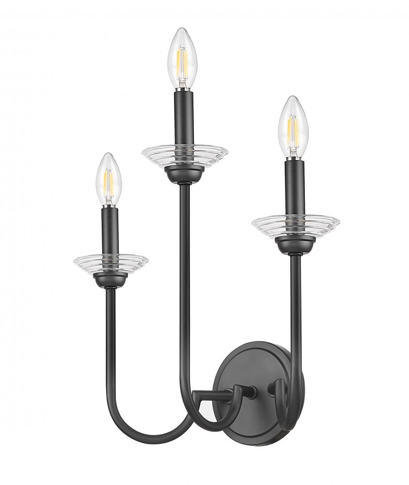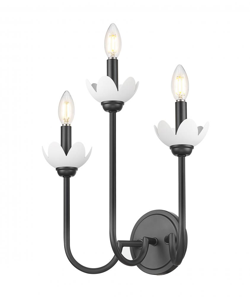 Floral bobeches, in interchangeable white metal and clear glass, bring vintage character and charm to this transitional three-light wall sconce. J-shaped arms of varied lengths showcase a rich matte black finish and create dimensionality in your bath or dressing area. Candelabra bulbs complete the look and offer bright, direct illumination for every occasion.