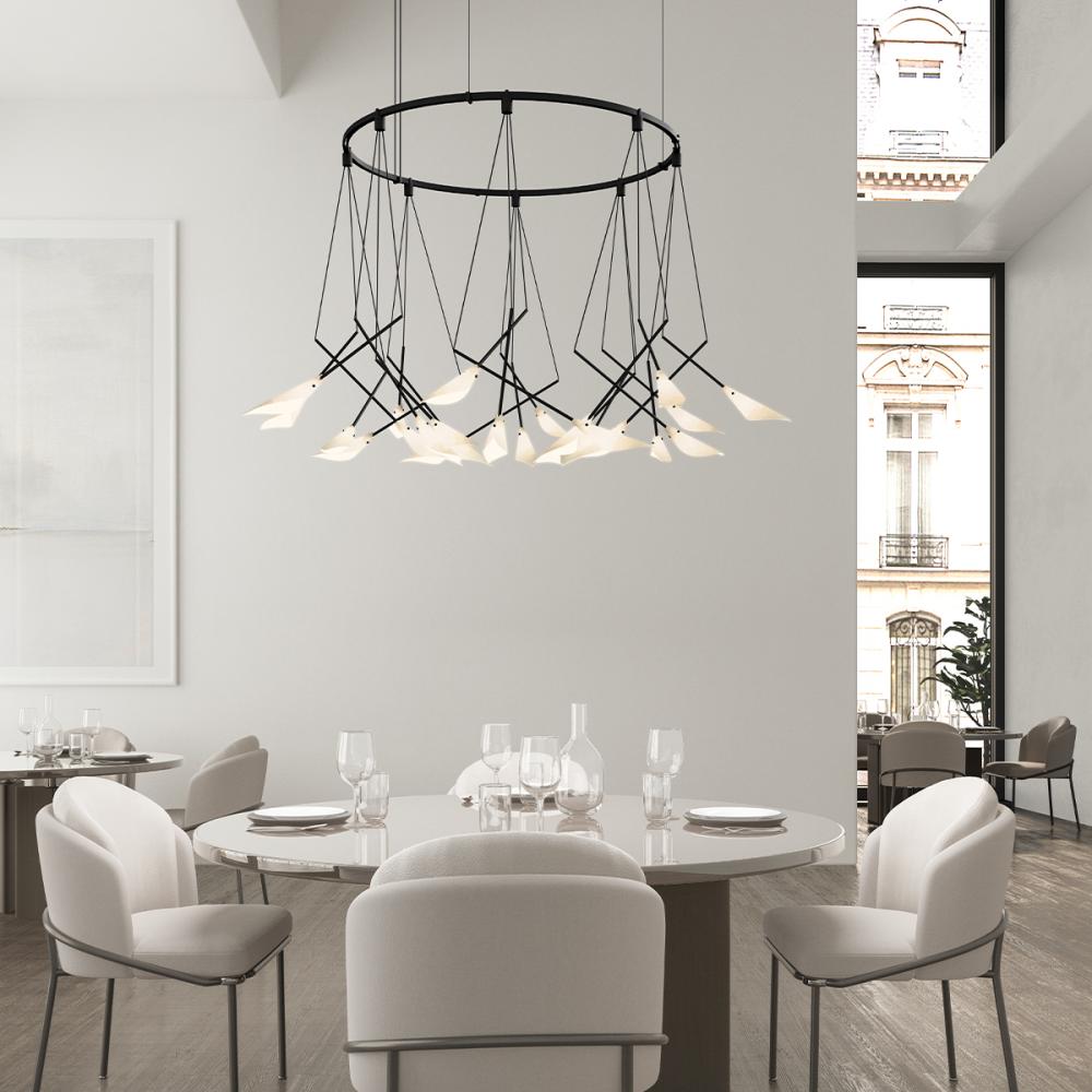 Calla lily-shaped petal shades of luminous polymeric material are joined in an organic arrangement of delicate lighting branches that are suspended by cords to single points of connection around the circumference of a Ring Power Bar