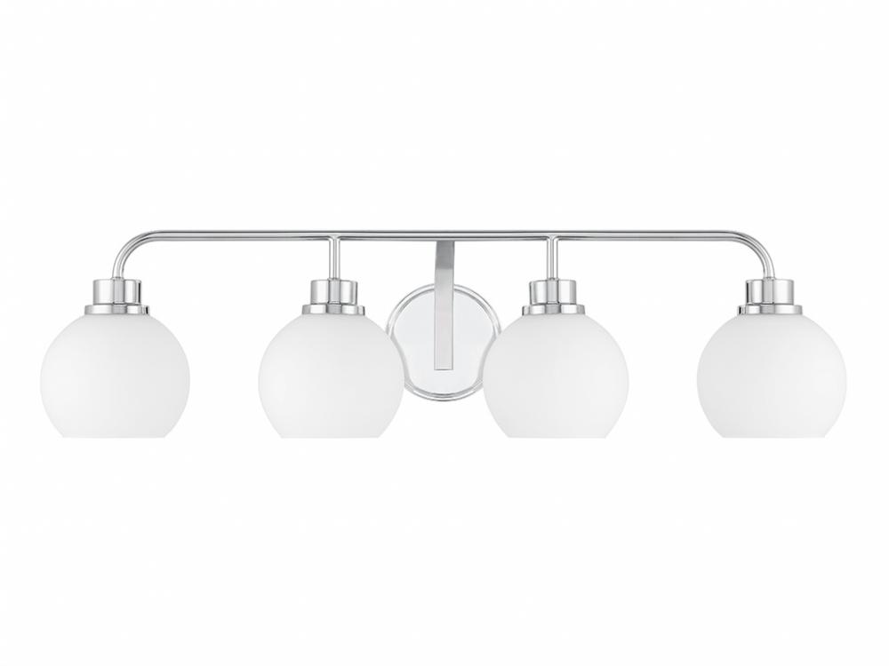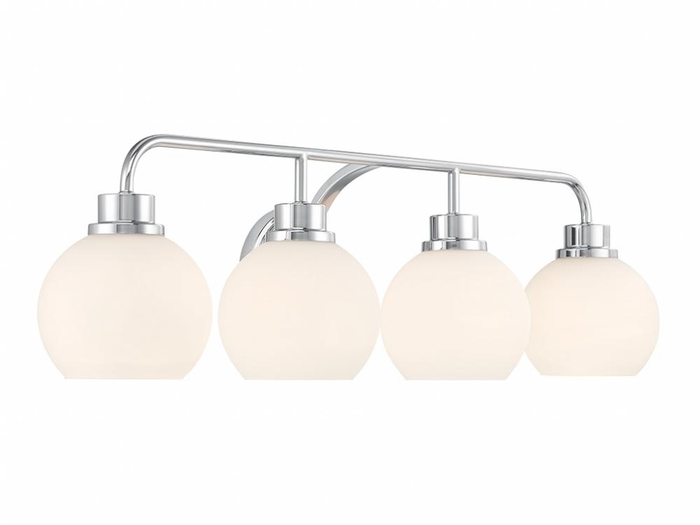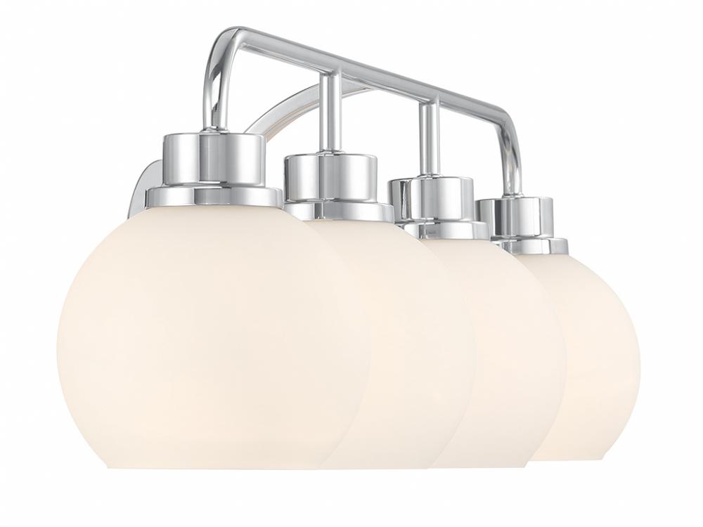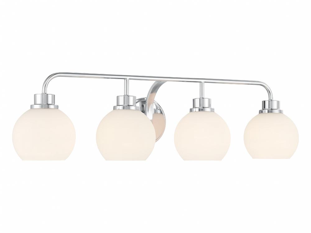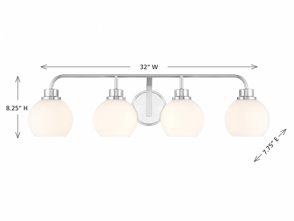 Freshen up your bathroom with the sleekly timeless style of this 4-light bath bar, which features orb-shaped shades of white opal glass that are open at the bottom and a versatile Chrome finish. It is 8.25" in height, 32" in width and extends 7.75" from the wall. It uses 4 standard size bulbs of up to 60 watts per bulb. Bulbs not included.
