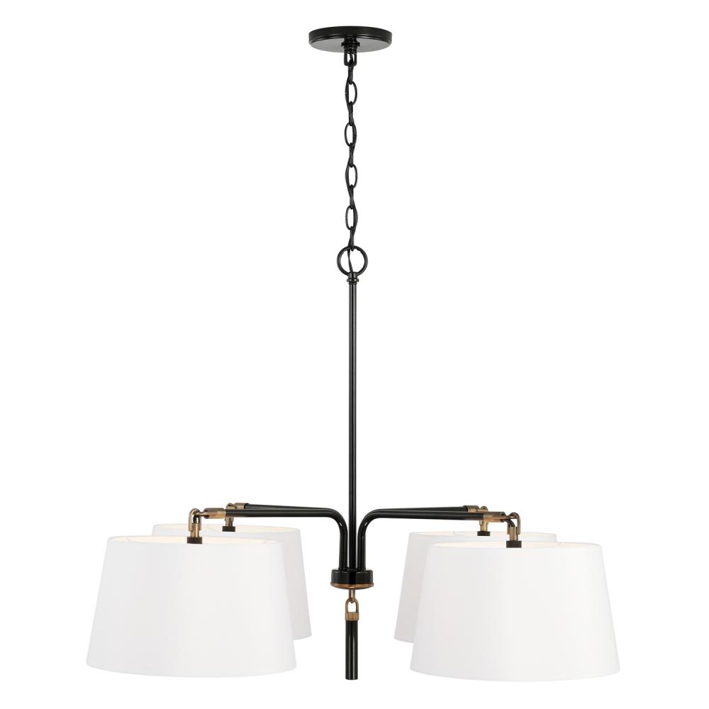 The striking contrast of the Glossy Black finish with the tailored fabric shades gives a perfectly polished look to the Beckham 4-Light Chandelier. The solid metal tassel detail is accented with Aged Brass loops for a sleek silhouette that is both bold and refined.