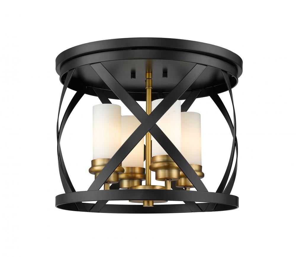 Enhance your home lighting with the eclectic charm of this two-tone four-light flush mount light. It features a combination matte black and olde brass finish in a stylish round design highlighted by an X-cross pattern. You and yours will enjoy the immediate upgrade in ambiance this light brings to any hallway, bedroom, dining room, or living room.