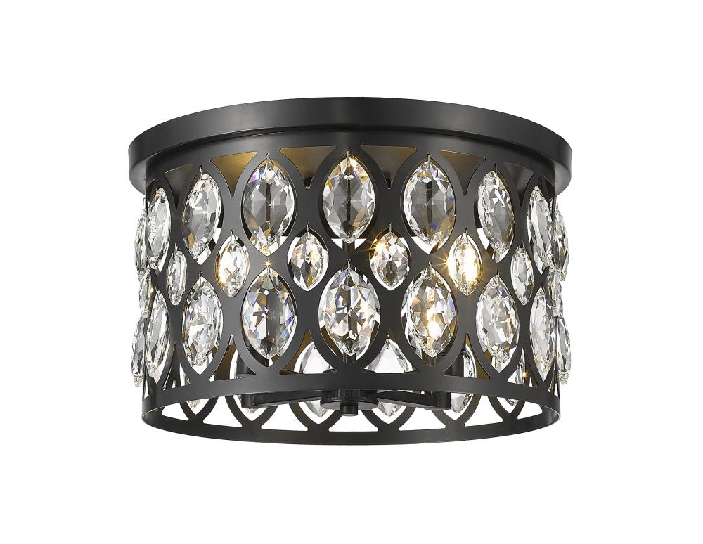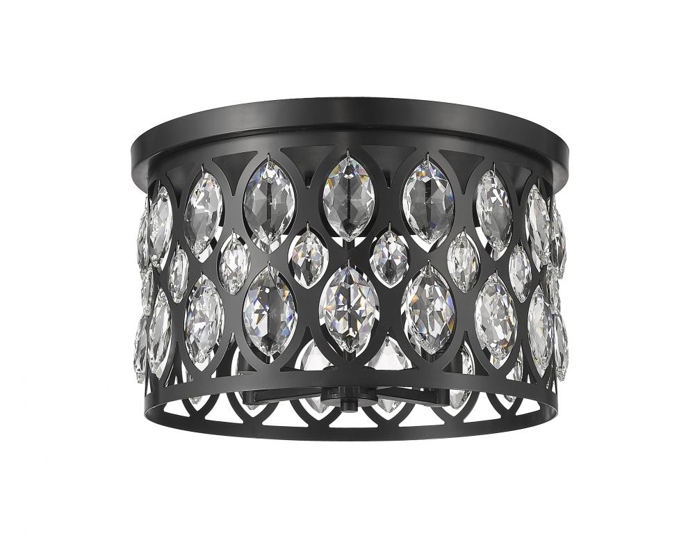 Exquisite and glamorous, this four-light contemporary flush mount ceiling light from the Dealey collection is the perfect addition to a Hollywood Regency style home foyer or hallway between rooms. Featuring a matte black steel shade, complete with striking ellipse-shaped cut outs with glimmering clear crystal pendants, this flush mount light lends a dramatic, contrasting look. With three candelabras set behind the crystals, this low profile fixture also creates a charming fractalized illumination along the walls and footpath.