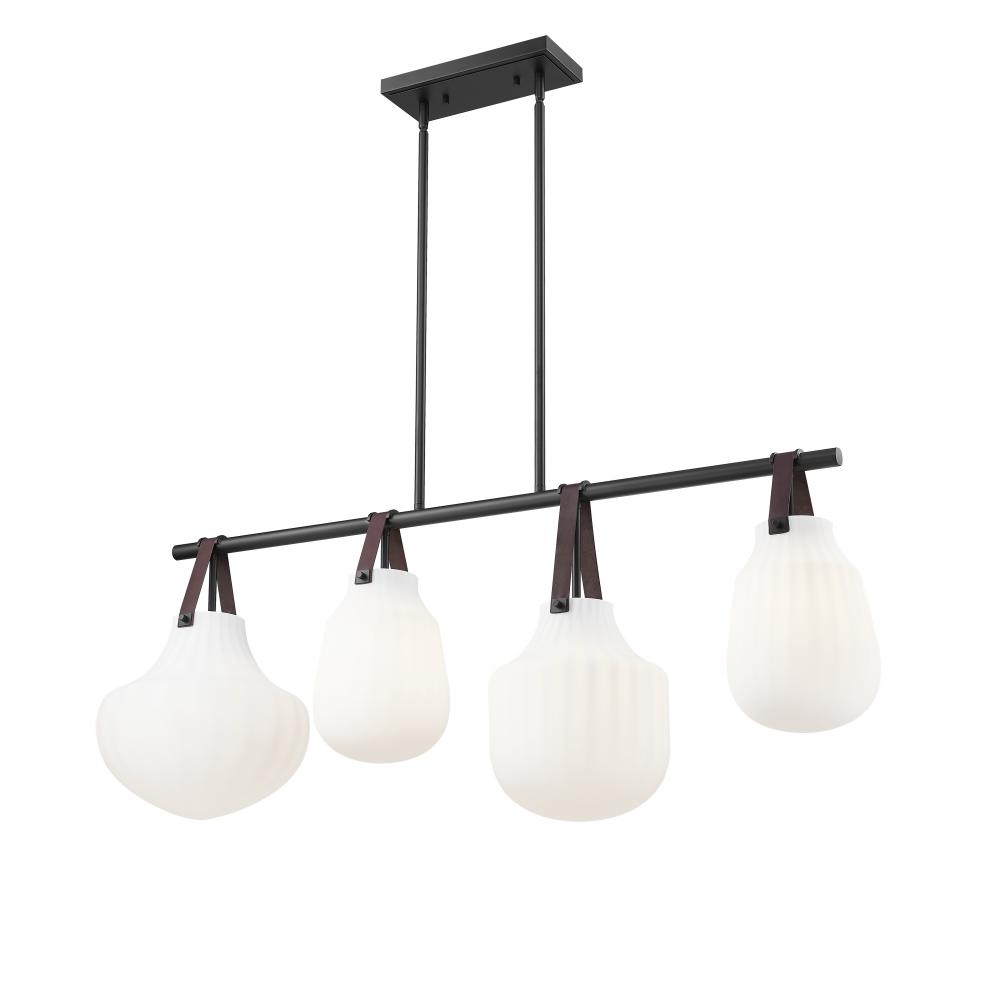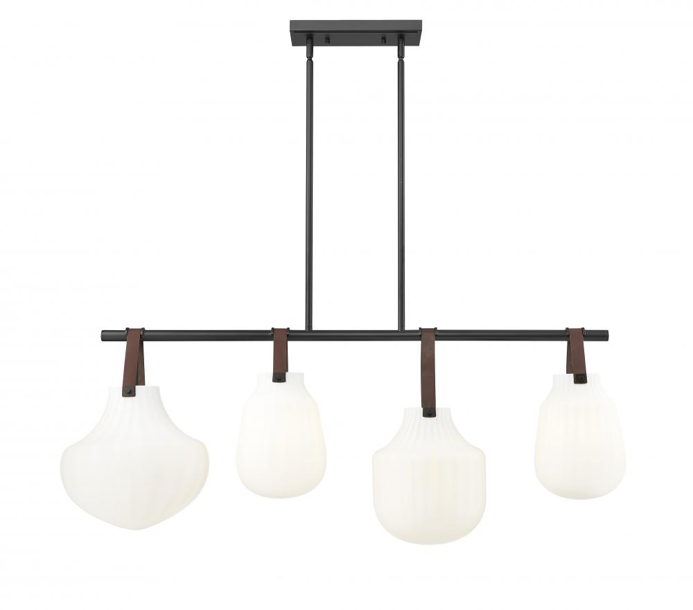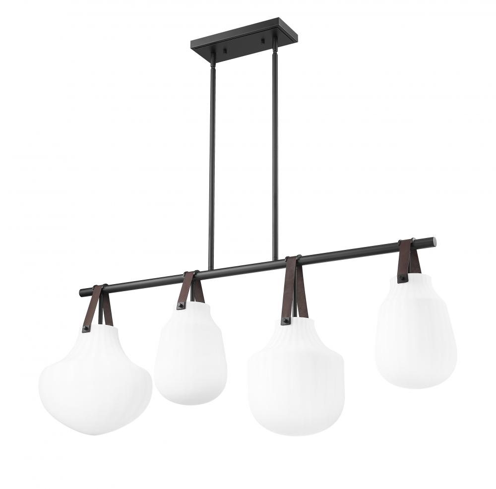 Bold curves and charming leather straps create a fresh modern farmhouse aesthetic for a charming four-light linear pendant. Striking over a kitchen island or table, it pairs a matte black finish with the clean-lined structure, creating a striking framework for exceptional glasswork. Four ribbed white glass shades, each in a different, undulating shape are suspended with a thick leather strap, adding organic character and impressive texture to your space.