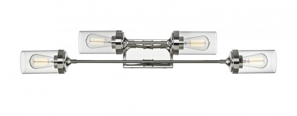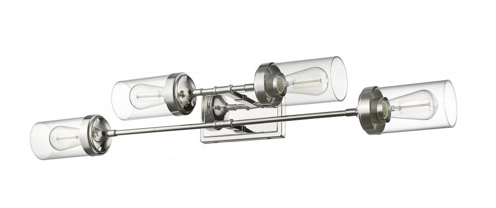 This enticing four-light vanity fixture delivers the sleek look of polished nickel steel and the charming allure of clear glass cylindrical shades. Linear styling creates an eye-catching effect that goes a long way toward polishing the look of an updated master or guest bath.