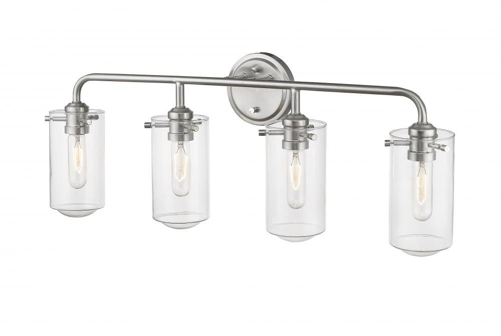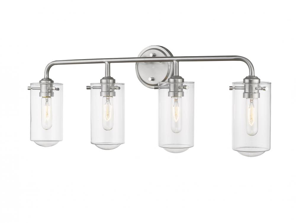 All eyes avert upward to take in the beautiful design of this four-light bath light. Gorgeous brushed nickel steel and clear glass shades form a delicate look with an edgy industrial aesthetic.