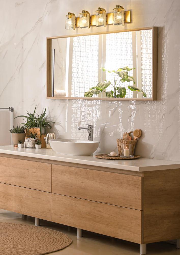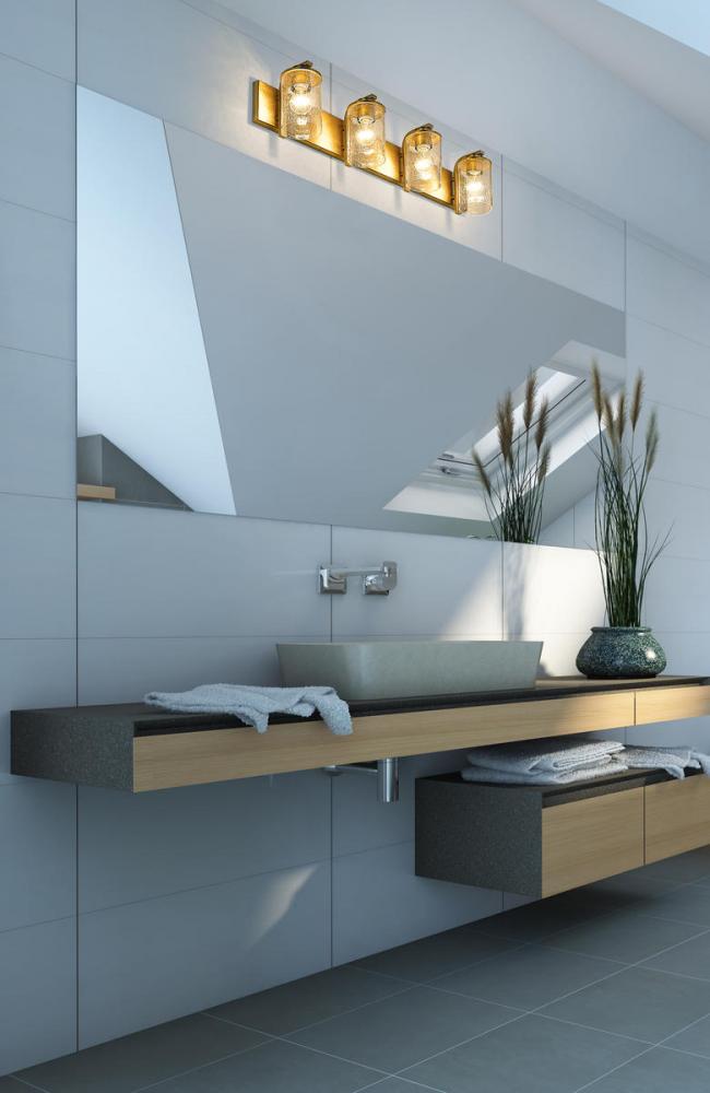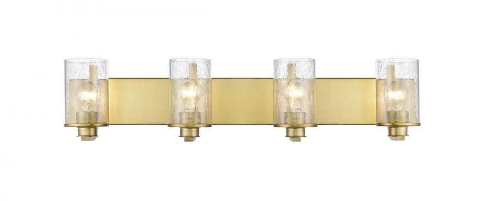 This four-light vanity light from the Beckett collection offers a minimalist look with customized materials. Create a sophisticated aesthetic in a mid-sized bath or dressing space with a fixture formed of warm olde brass finish steel and highlighted with the romantic look of cylindrical clear seedy glass shades.