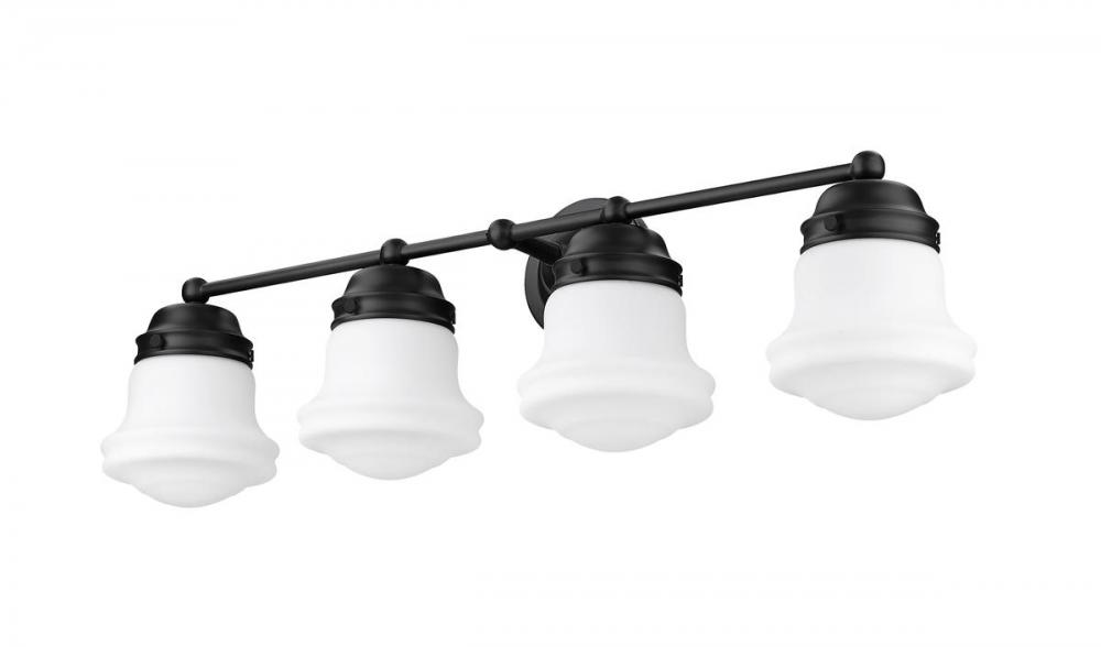Indulgent village-inspired charm mixes nautical with industrial, forming a themed look that lifts the ambiance in any bath space. This four-light vanity light from the Vaughn collection embellishes a mid-size bathroom with a contrasting blend of matte black finish steel and matte opal glass shades in a schoolhouse silhouette.