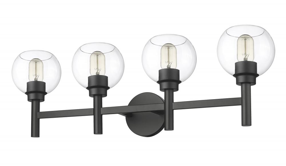 A precise, perfect circle creates the inspirations for the modern ambiance of third contemporary four-light vanity wall light. Designed for the Sutton collection, the sconce showcases four of torch-style lights paired with steel framing and a round wall plate, all in a crisp matte black finish. A quartet of open-edged globe shades are expertly crafted in thick, clear glass, delivering maximum illumination to your vanity and bathroom space.