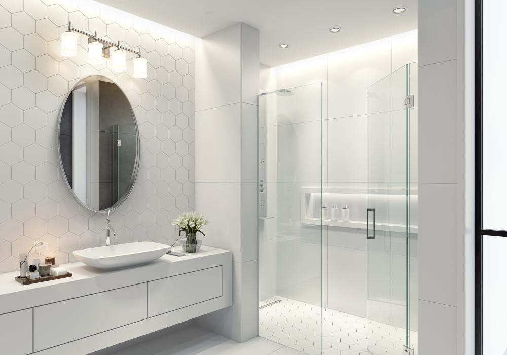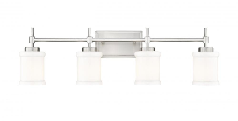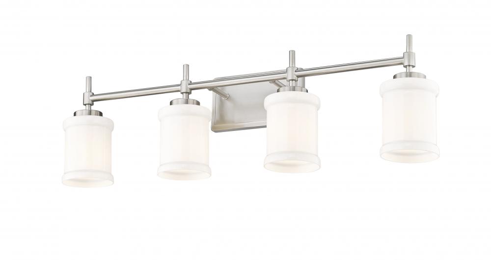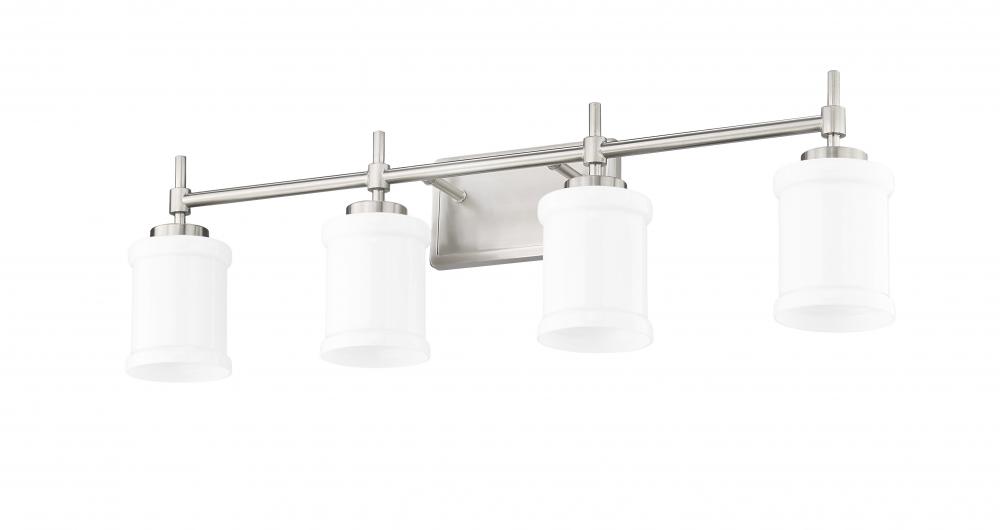 Span a generous sink or counter with the fresh, contemporary style of a modern four-light vanity fixture. Sleekly designed, it showcases clean lines and elegant cuff details that add the perfect dose of character and dimensionality. Glossy white opal glass shades pair with a crisp brushed nickel finish to create a fresh, refined look and feel, in any bathroom.