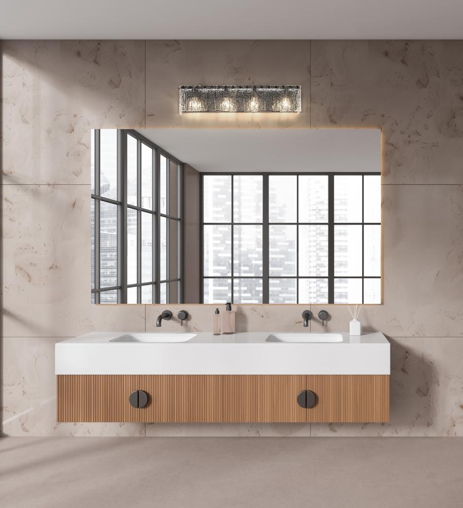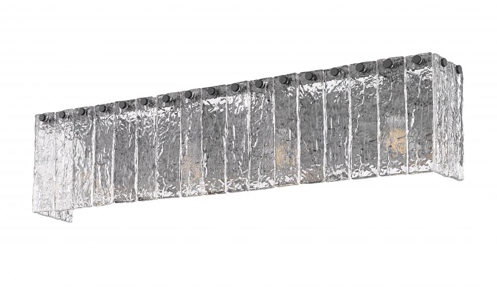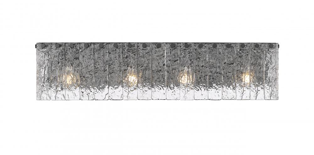 Spark sophistication and elegance with a modern four-light vanity bath light that showcases icy radiance. Its textured glass panels create a fresh, refined silhouette, perfect for a primary or guest en suite. A matte black finish highlights its frame, adding bold contrast and character.