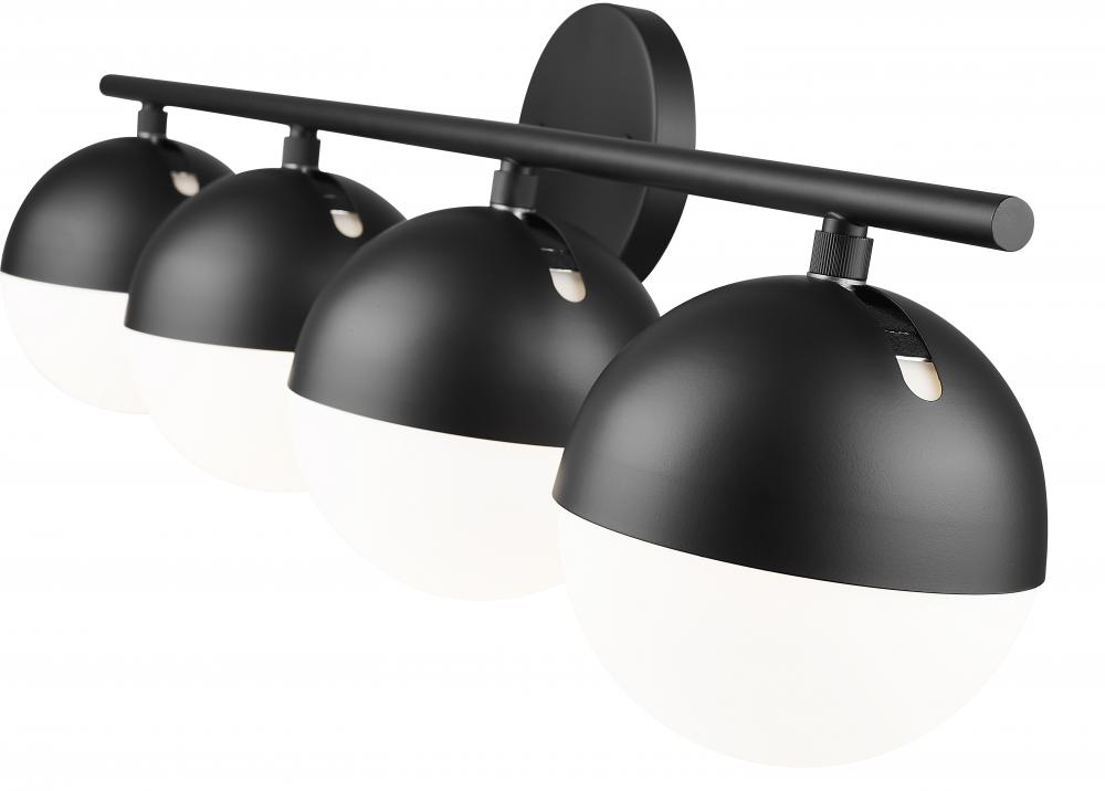Reimagine your bathroom space with the vintage inspirations and fresh style of this mid-century four-light vanity bath light. In matte black, it maximizes contrast and depth, pairing perfectly with contemporary, urban and restoration design themes. Its moveable metal shades allow for customization, while orbs of matte opal glass create soft, inviting illumination for all your grooming and beauty tasks.