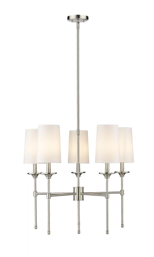 Emulating the most sophisticated design motifs, the Emily five-light chandelier adds a tasteful dose of decadence tempered by softness. This fixture features a carefully aligned collection of five lamp-like lights with off-white shades that encircle a frame fashioned of brushed nickel finish metal. A neutral palette creates welcomed versatility to blend with variable ensembles, and a classic aesthetic fit for an upscale living space.