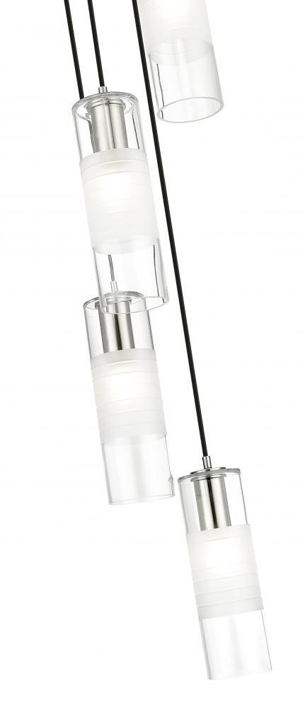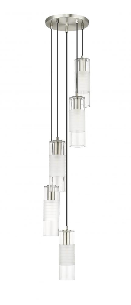 A spiraling fall of five lights create a chic presentation for a modern chandelier. From the Alton collection, it boasts substantial housings and a round canopy, all in a gleaming brushed nickel finish. Artisan clear and frosted glass creates a chic shade, diffusing illumination to create a welcoming ambiance in your foyer or living room.