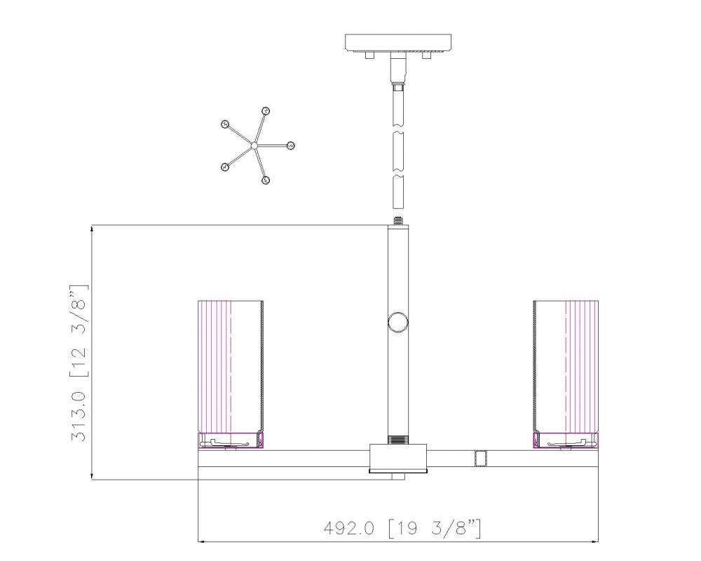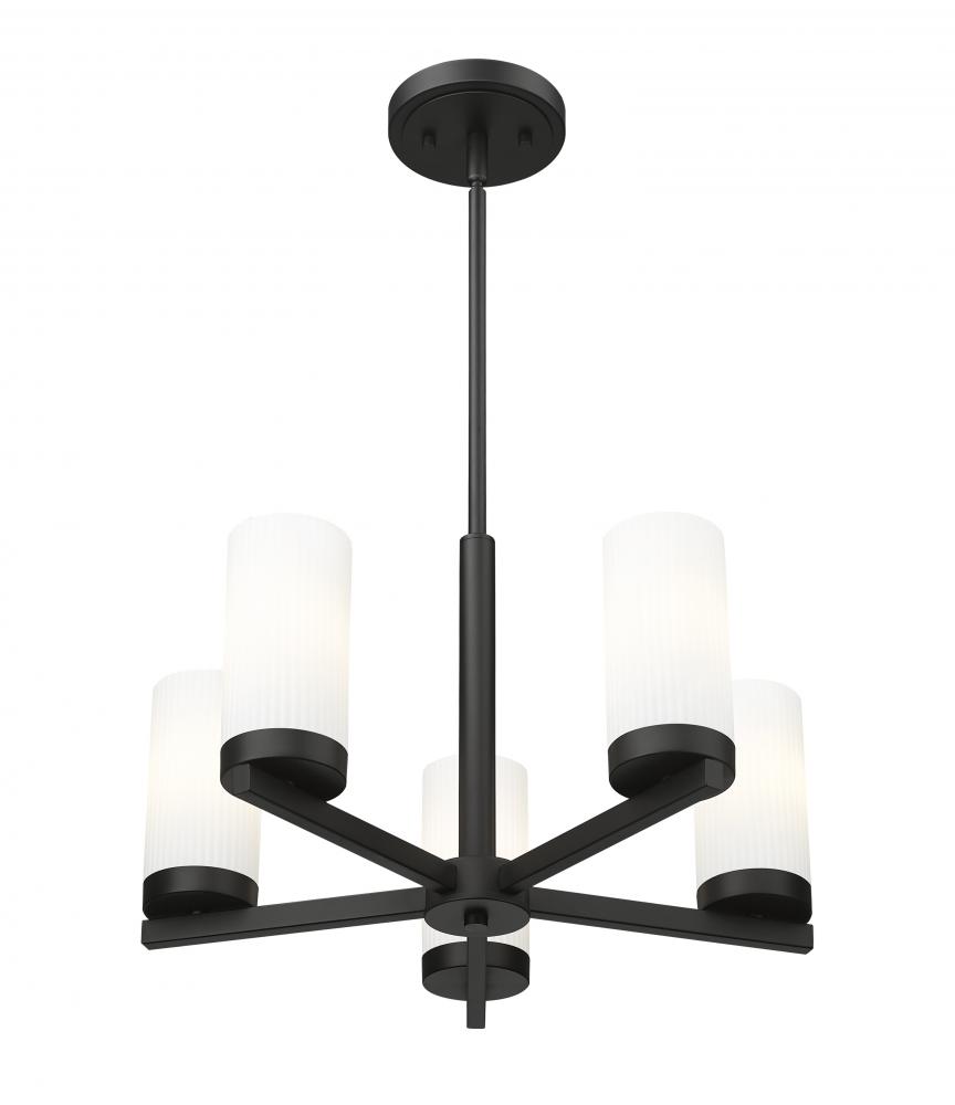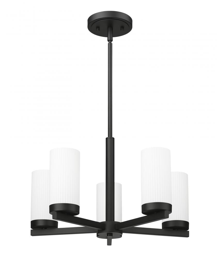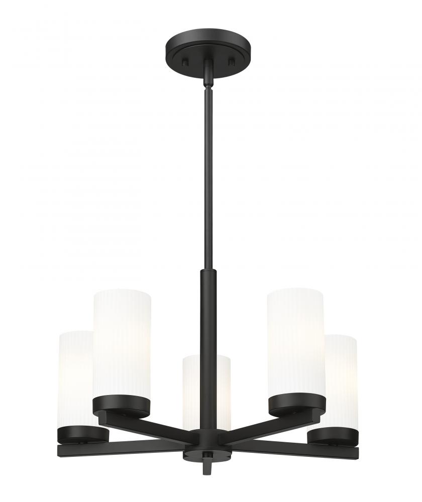 Radial arms create a compact profile for a modern five-light chandelier. Its fresh simplicity plays well in a variety of settings, from dining rooms to foyers and bedrooms. A rich matte black finish creates depth and contrast, while white glass cylinder shades create dimension and contrast while delivering excellent illumination for tasks and ambiance.