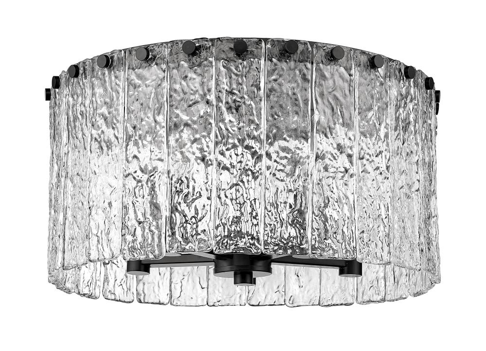Artistry joins industrial minimalism to produce a compelling look in light fixtures that work in both modern and transitional settings. The Glacier five-light flush mount ceiling light offers a decadent look of individual clear textured glass panels that emulate melting ice, an extraordinary effect with dramatic impact in a kitchen or bar space. Matte black finish steel is placed as a crown frame, adding a contrast in both style and finish and embellishing the optical delight accomplished when the fixture is illuminated.