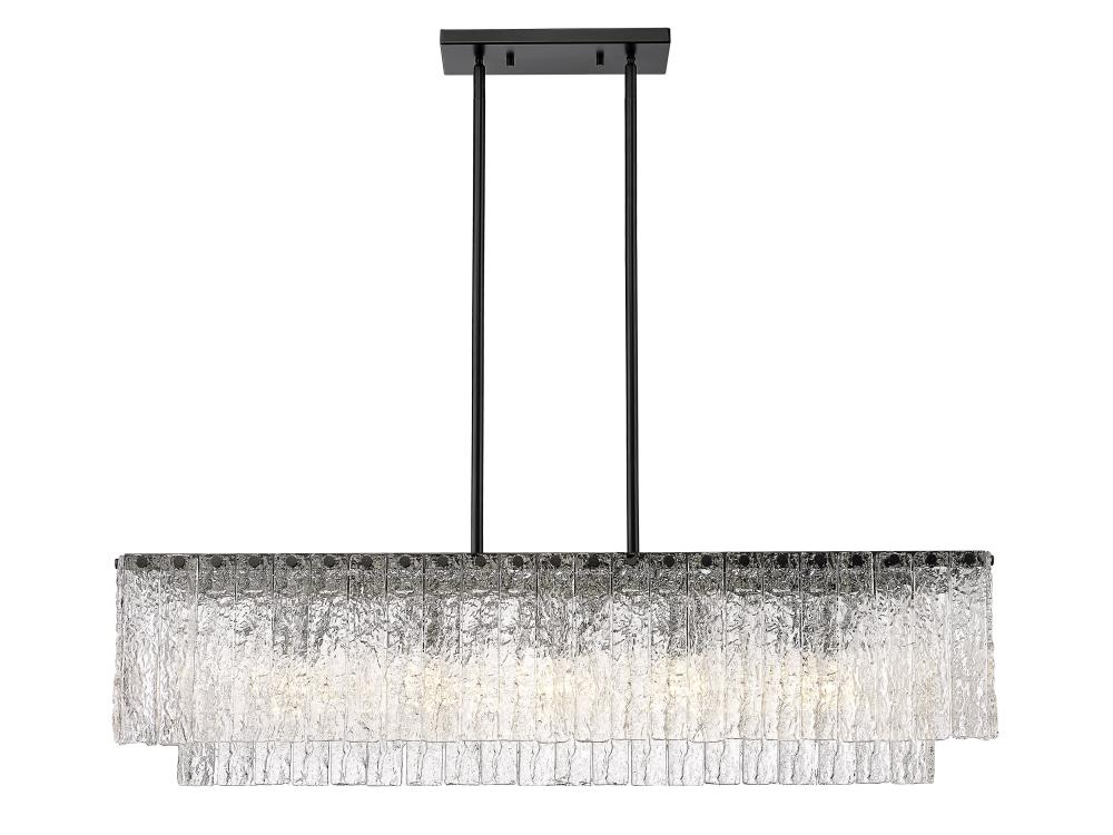Build an artistic version of frosty ice with this five-light island light beautifully balancing delicacy with rugged industrial personality. The Glacier island light offers a decadent look of individual textured glass panels that emulate melting ice, an extraordinary effect with dramatic impact in a kitchen or bar space. Matte black finish steel creates a bold frame and canopy, adding a contrast in both style and finish, embellishing the optical delight accomplished when the fixture is illuminated.