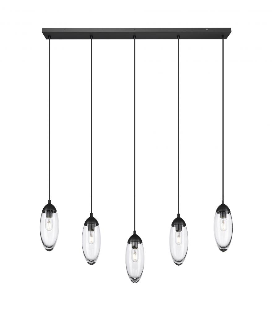 An enticing placement of radiant teardrop glass shades creates a study in architectural artistry perfect to frame a kitchen island or dining space in a contemporary setting. This five-light chandelier delivers organic sensibility with enough pizazz to attract attention as it emits reflective illumination in shades that dangle from a bold matte black finish metal canopy.