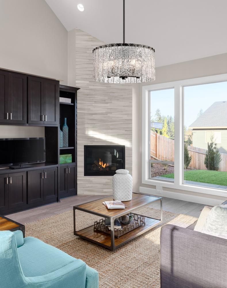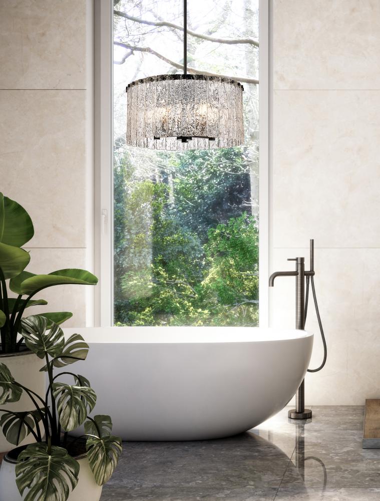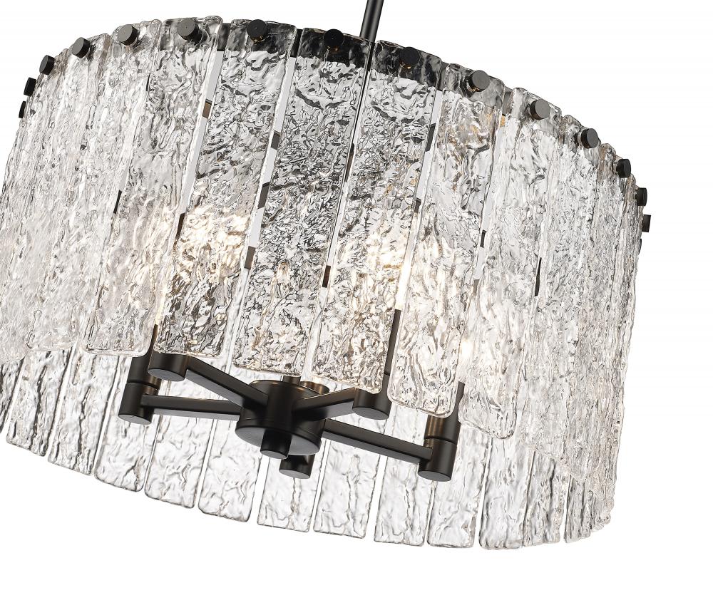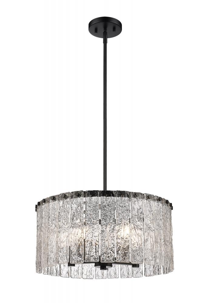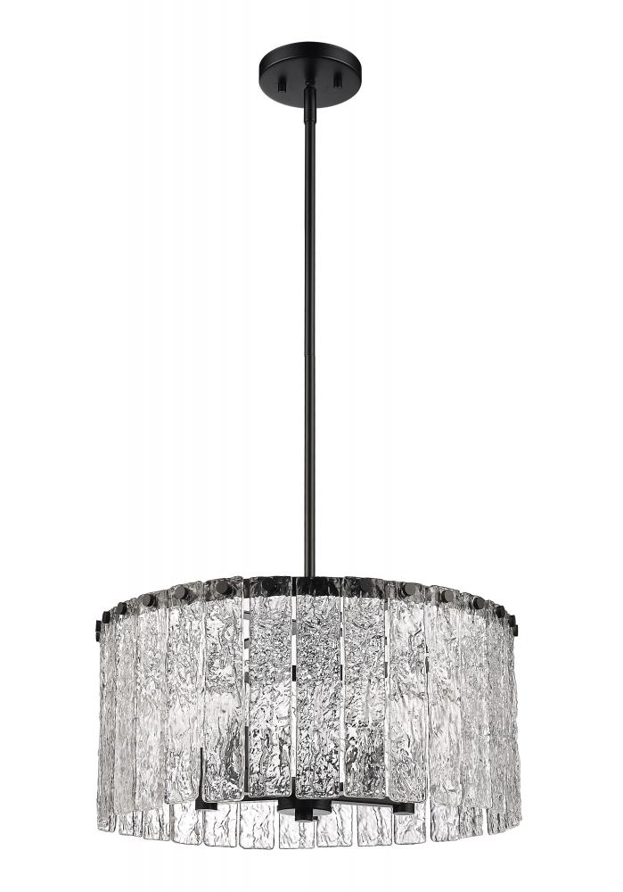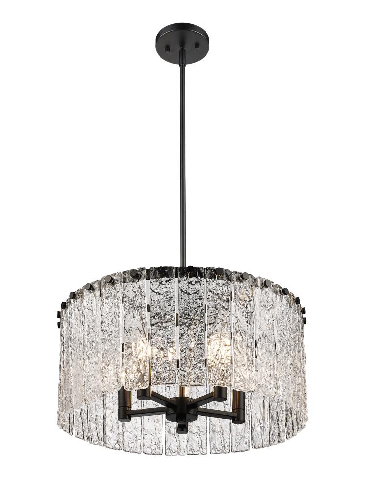 Bold matte black metal and icy textured glass blend to create the perfect mix of industrial grit and art in a fixture that dazzles in any modern or transitional space. The Glacier round five-light pendant delivers a gallery aesthetic with individual clear textured glass panels that emulate melting ice, a chic design with dramatic impact. Matte black finish steel is placed as a crown frame, providing tantalizing contrast and enhancing the gallery feel of a foyer or main living area.