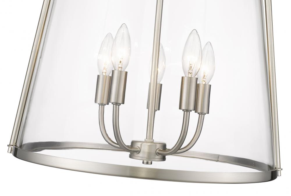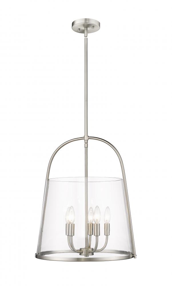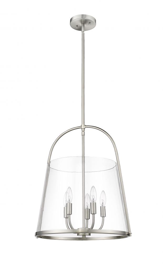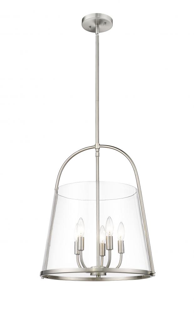 From the Archis collection comes a stylish yet minimalist look in lighting with a versatile motif ideal for any modern or transitional space. This five-light pendant offers a touch of nautical charm in a bell-like silhouette with brushed nickel finish steel framing and a delicate clear glass shade. Candelabra lamping brings a hint of soft elegance and a classic artisanal vibe that suits a dining space, living area, or entryway.