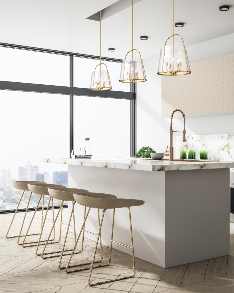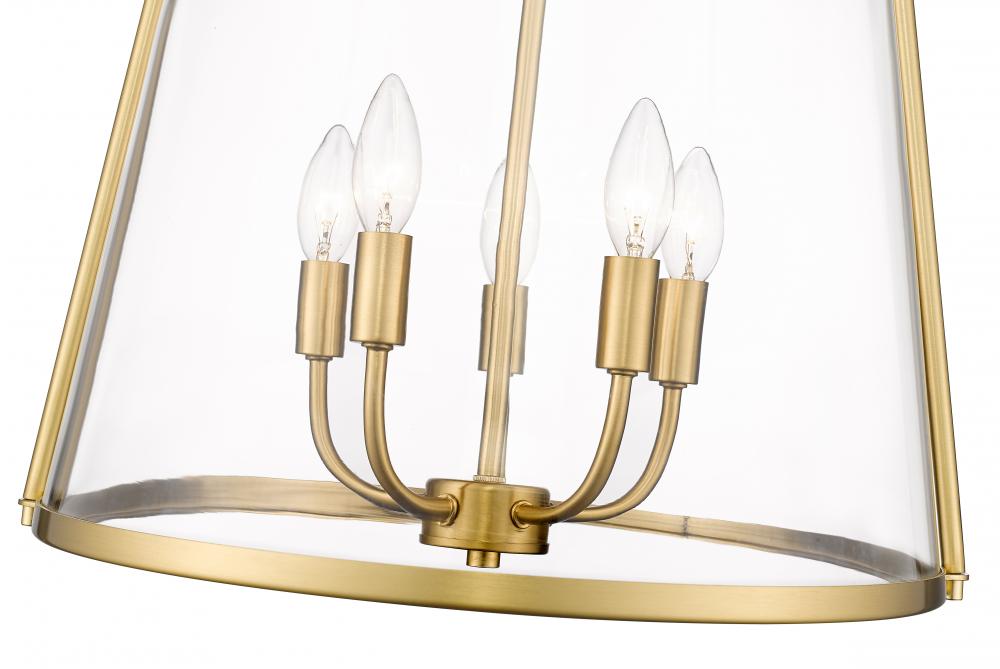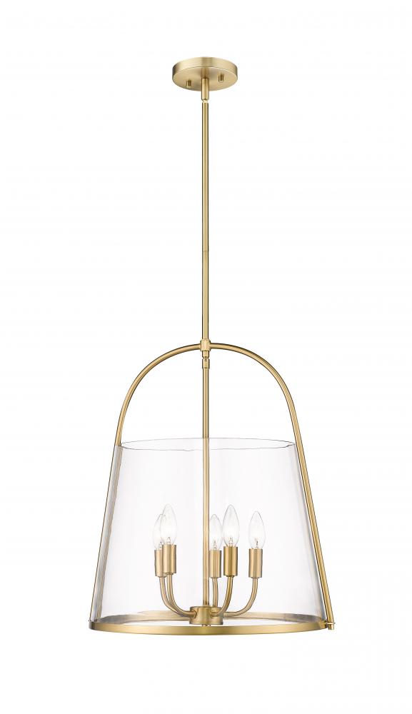 Elevate the artisanal quality of a modern or transitional space with a fixture reflecting decadence and minimalism simultaneously. This five-light pendant from the Archis collection offers a touch of nautical charm in a bell-like silhouette with warm modern gold finish steel framing and a delicate clear glass shade. Candelabra lamping brings a hint of soft elegance and a classic artisanal vibe that suits a dining space, living area, or entryway.