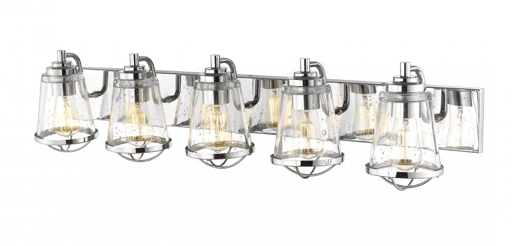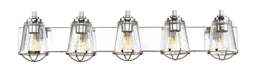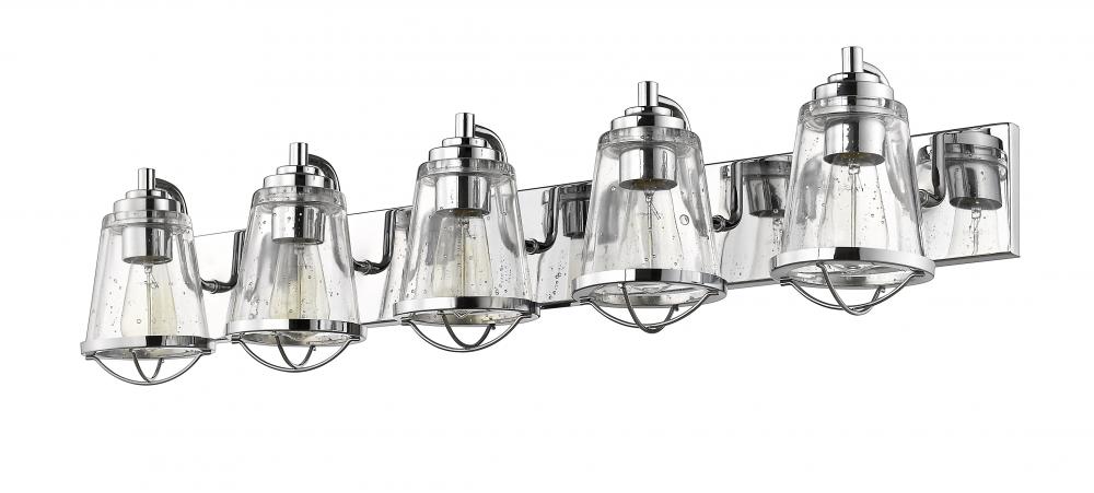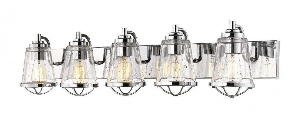 At the center of a contemporary, stylish bath space lies this personality-rich five-light vanity fixture. Indulge in a charming maritime theme that marries sleek chrome finish steel and seedy glass shades, with a dose of ornate metal trim.