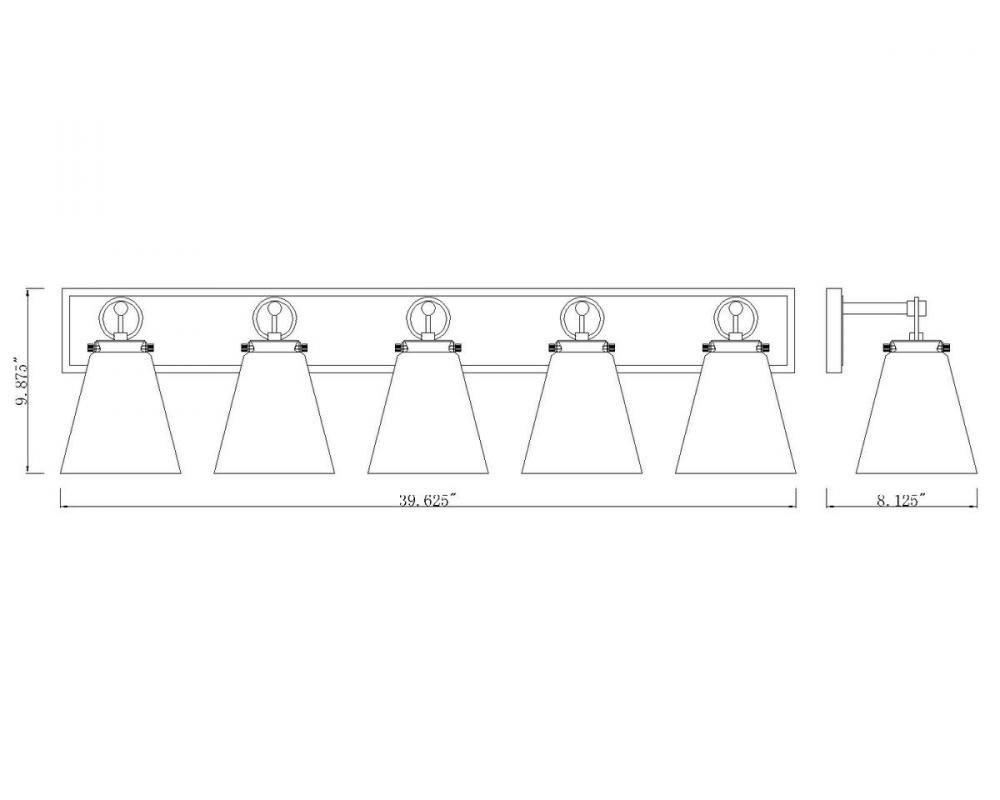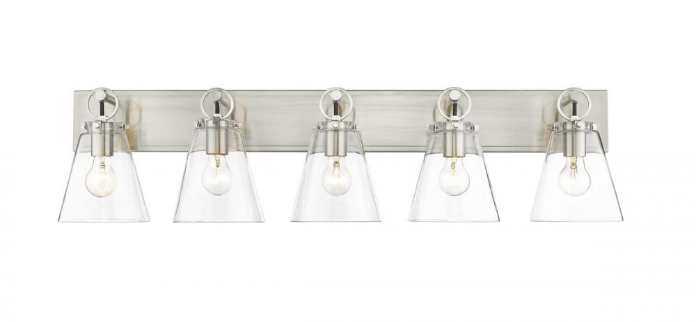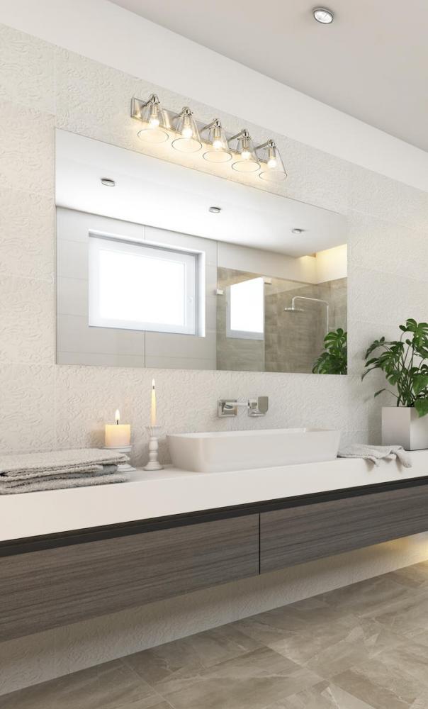 Graceful elegance follows linear styling to deliver a fashionable way to illuminate a contemporary bath space. This five-light vanity light from the Harper collection offers inspiring nautical charm with upscale materials and finishes. A brushed nickel finish steel wall mount and ring and peg accents add whimsical vibes to five delicate conical shades fashioned of sleek clear glass.