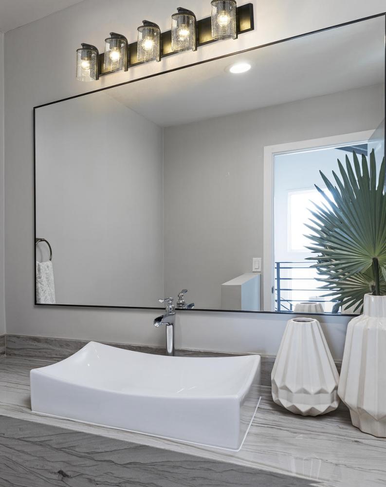 A modern version of nautical charm makes its way into this five-light vanity light from the Beckett collection, adding a pleasing touch to any space. Larger bath areas light up with this vanity light fashioned of bold matte black finish steel with a rectangular wall mount and charming accents. Clear seedy glass shades in cylindrical form offer a delicate, natural infusion of romance.