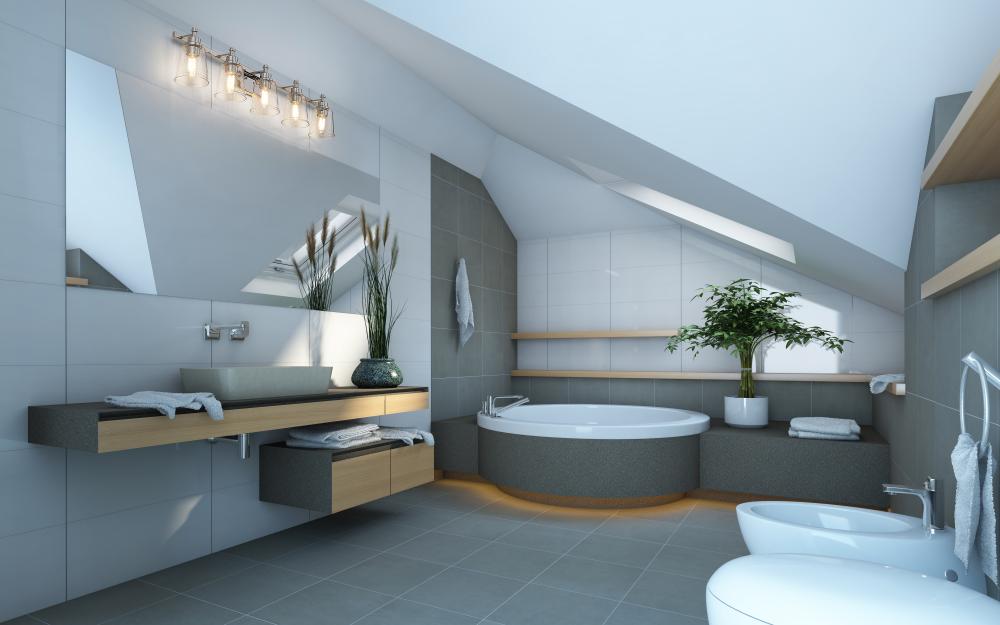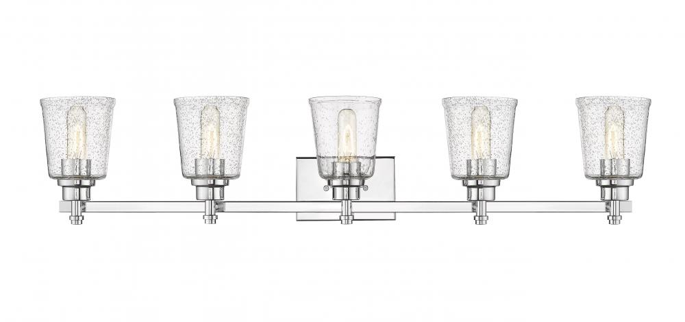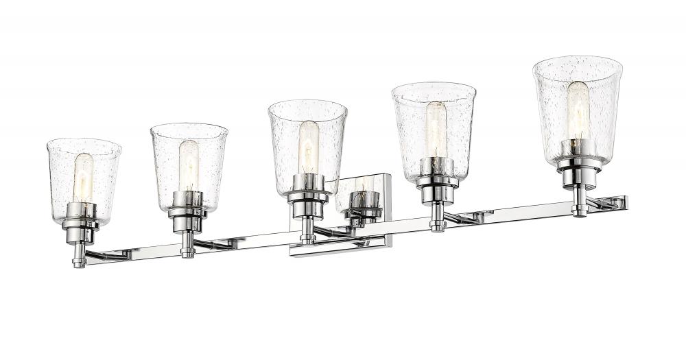 A master en suite gains exceptional elegance with this chrome five-light vanity light. Enjoy the artistic and architectural design of a stunning fixture with clear seedy glass shades, offering a perfect fit to both contemporary and transitional decor schemes.