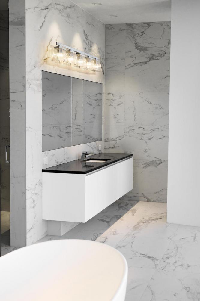 A five-light vanity light in chrome is a quick and easy way to include farmhouse-chic character to your bathroom. The clear glass shade is ribbed for additional aesthetic allure.