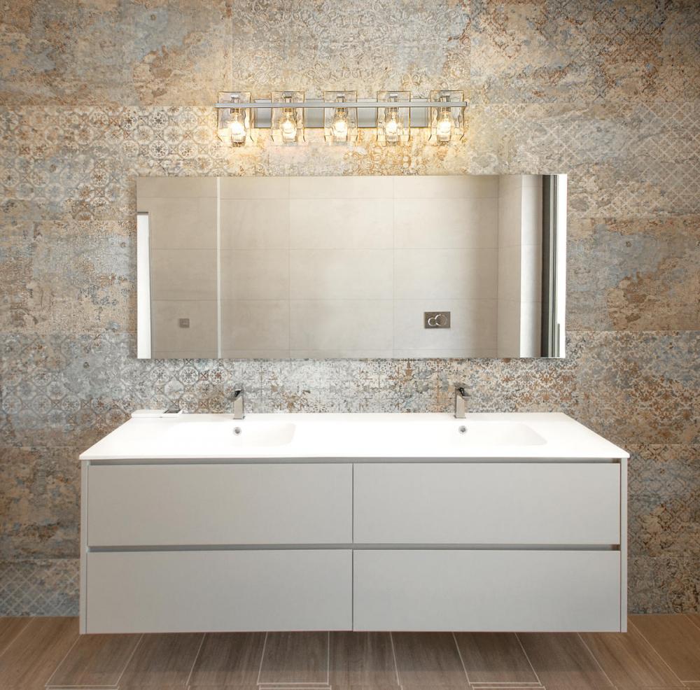 Rippled clear glass shades serve as a focal point on this five-light vanity. The fixtures steel is enhanced with a brushed nickel finish while captivating with clean lines.